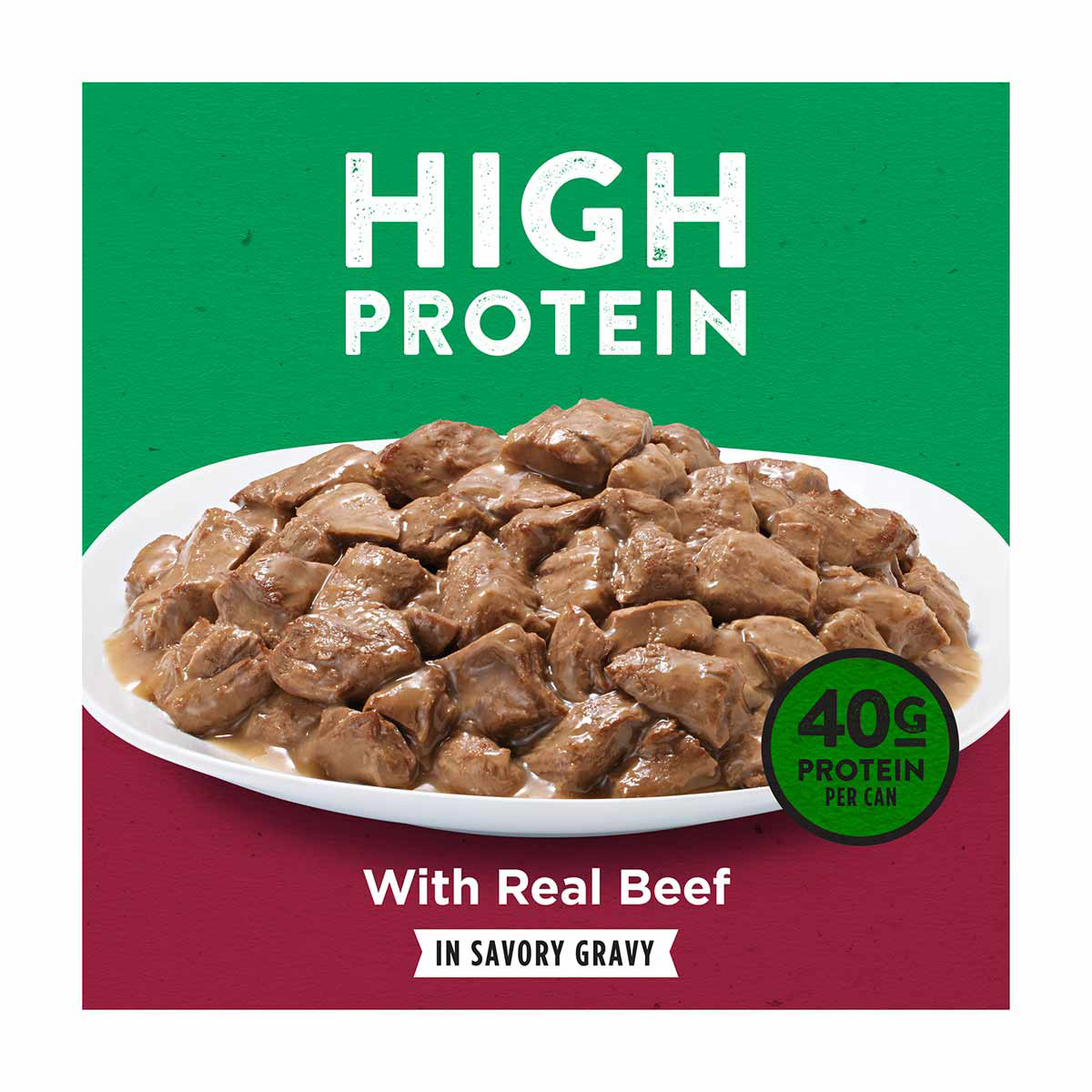 - Show your dog just how much you care about him by putting Purina Dog Chow High Protein With Real Beef in Savory Gravy wet dog food on the menu. This delicious wet canned dog food recipe made with real beef comes packed with 40 grams of protein in each can to help your canine companion maintain his strong, lean muscles. Purina makes this Dog Chow dog food with high protein without artificial flavors or preservatives. This delicious gravy dog food provides 100 percent complete and balanced nutrition for adult dogs with no artificial colors, flavors or preservatives, so you can be sure you're making the right decisions for his health and well-being. Please your adult dog's palate with this tasty Dog Chow Dog Food recipe with tender chunks in gravy, ensuring he doesn't lose interest at mealtime. Watch as he savors every last bite when you fill his dinner bowl with this wholesome Purina Dog Chow High Protein Wet Dog Food With Real Beef in Savory Gravy.