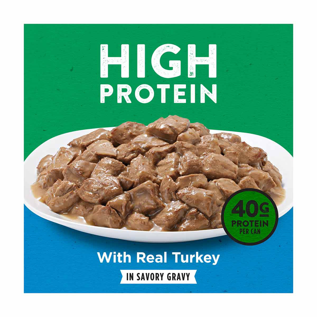 - Wow your favorite pal with a delicious meal option when you choose Purina Dog Chow High Protein Wet Dog Food With Real Turkey in Savory Gravy adult. With real turkey, this wholesome adult dog food formula is high in protein to help your best buddy build and maintain his strong muscles, so he's always ready to spring into action at playtime. Meaty chunks in this wet canned dog food recipe draw him to his bowl, while the savory dog food gravy keeps him interested as he devours every last bite. Try Purina’s other Dog Chow dog food recipes for tasty variety, including With Real Lamb in Gravy, With Real Beef in Gravy and With Real Chicken in Gravy. Rest easy knowing all Purina Dog Chow formulas contain 100 percent complete and balanced nutrition for adult dogs and are made without artificial flavors or preservatives. Opt for a meal that's fit for the canine king in your life when you open a can of Purina Dog Chow High Protein With Real Turkey in Savory Gravy adult wet dog food.