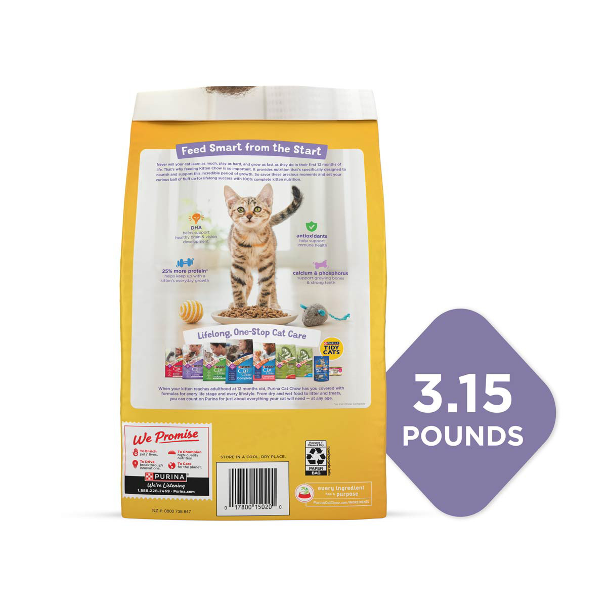 - Purina kitten food made with 25 percent more protein (vs. leading adult cat food) and real and delicious farm-raised chicken helps support the development of lean muscles as she jumps and plays