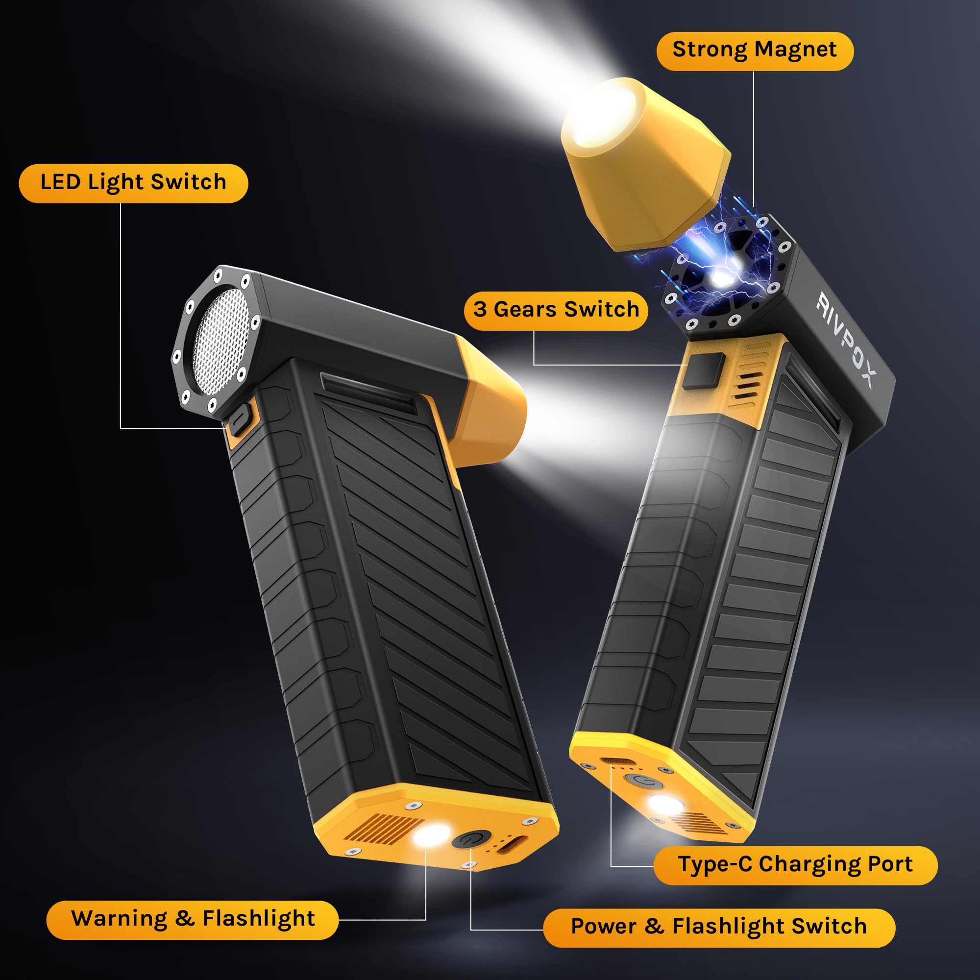 - 【Multi-purpose Use】This dust blower effectively tackles dust on computers, keyboards, and car interiors. It's also great for outdoor activities—use it to start fires, dry hair on people and pets, or clear snow and leaves from your car. Equipped with a light and SOS signal for added convenience.