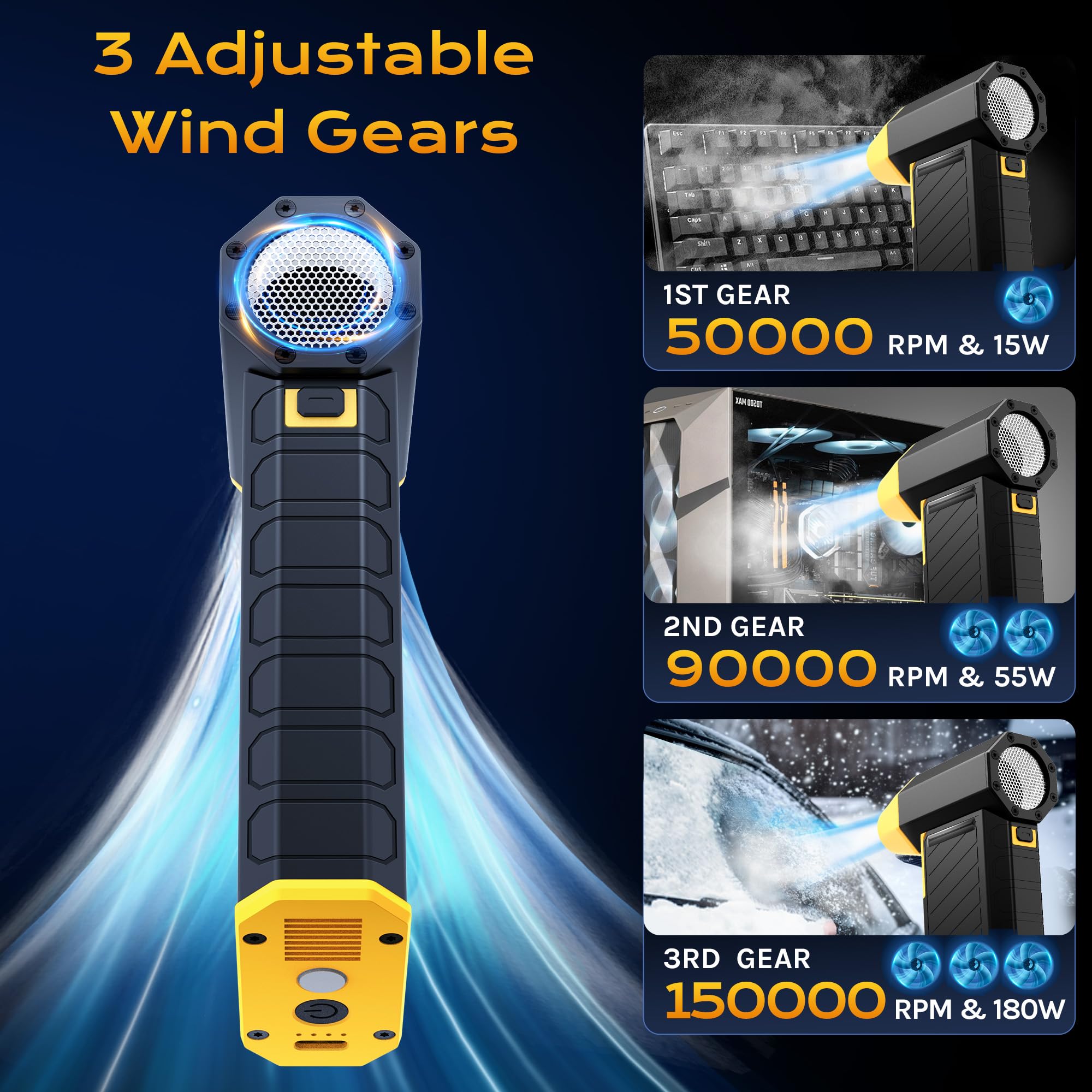 - 【Electric Air Duster Gun】Equipped with a high-speed brushless motor, this compressed air duster reaches up to 150,000 RPM and delivers over 200g-55m/s of force. It's the perfect, cost-effective replacement for expensive compressed air cans.