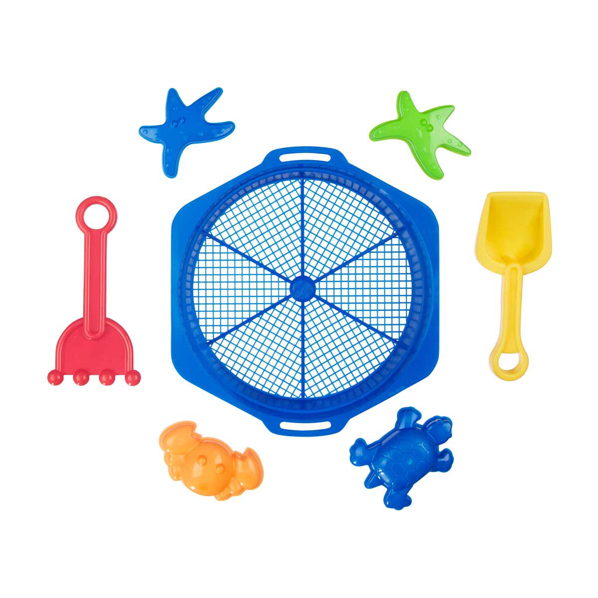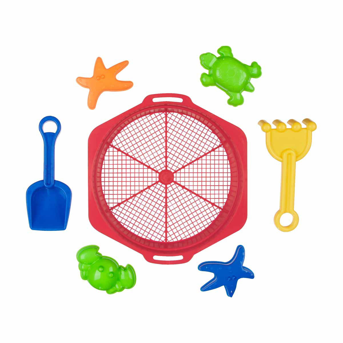 - - 7-piece beach toy set including a sand sifter, molds, shovels, and rakes- Bright and colorful designs to captivate children's interest- Comes in a convenient mesh bag for easy storage and cleaning- Made from non-toxic, child-safe materials- Perfect for creative play and outdoor fun at the beach- Suitable for children aged 3 and up