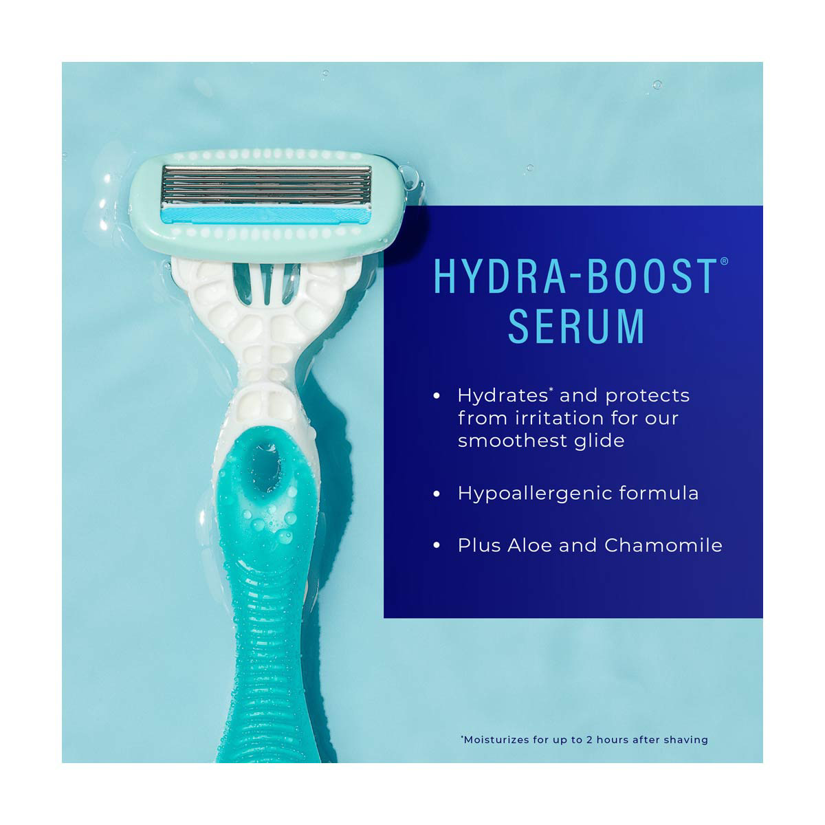 - Infused with a hypoallergenic Hydra-Boost serum containing aloe and chamomile to hydrate and protect your skin from irritation