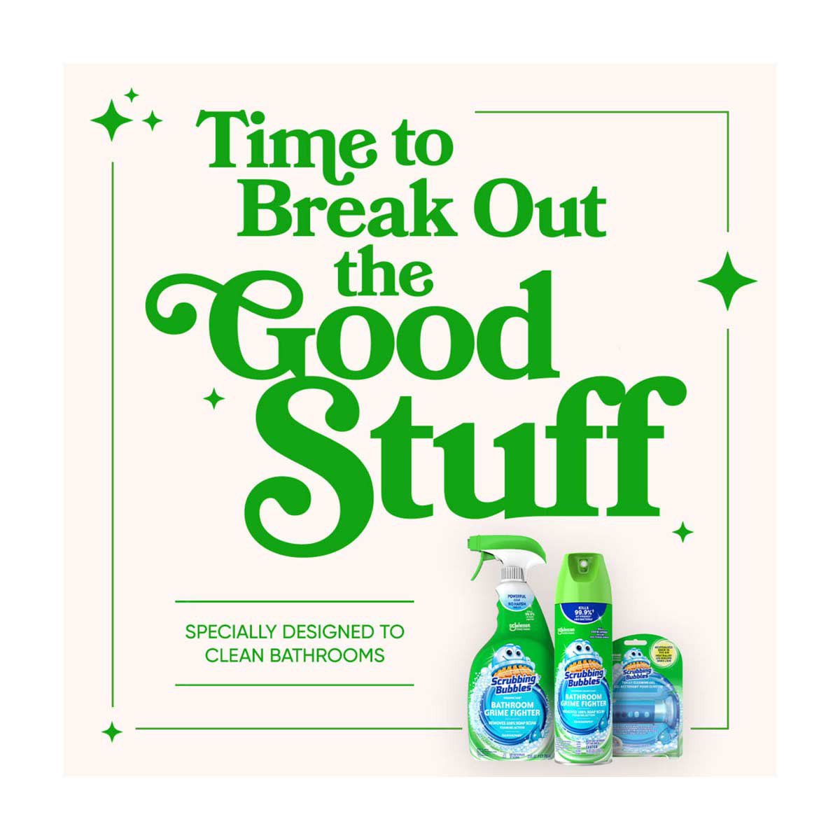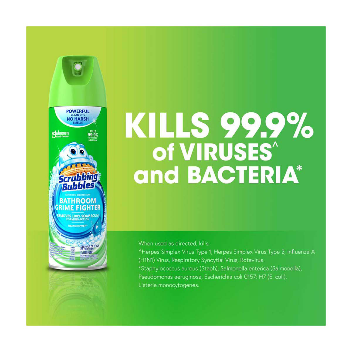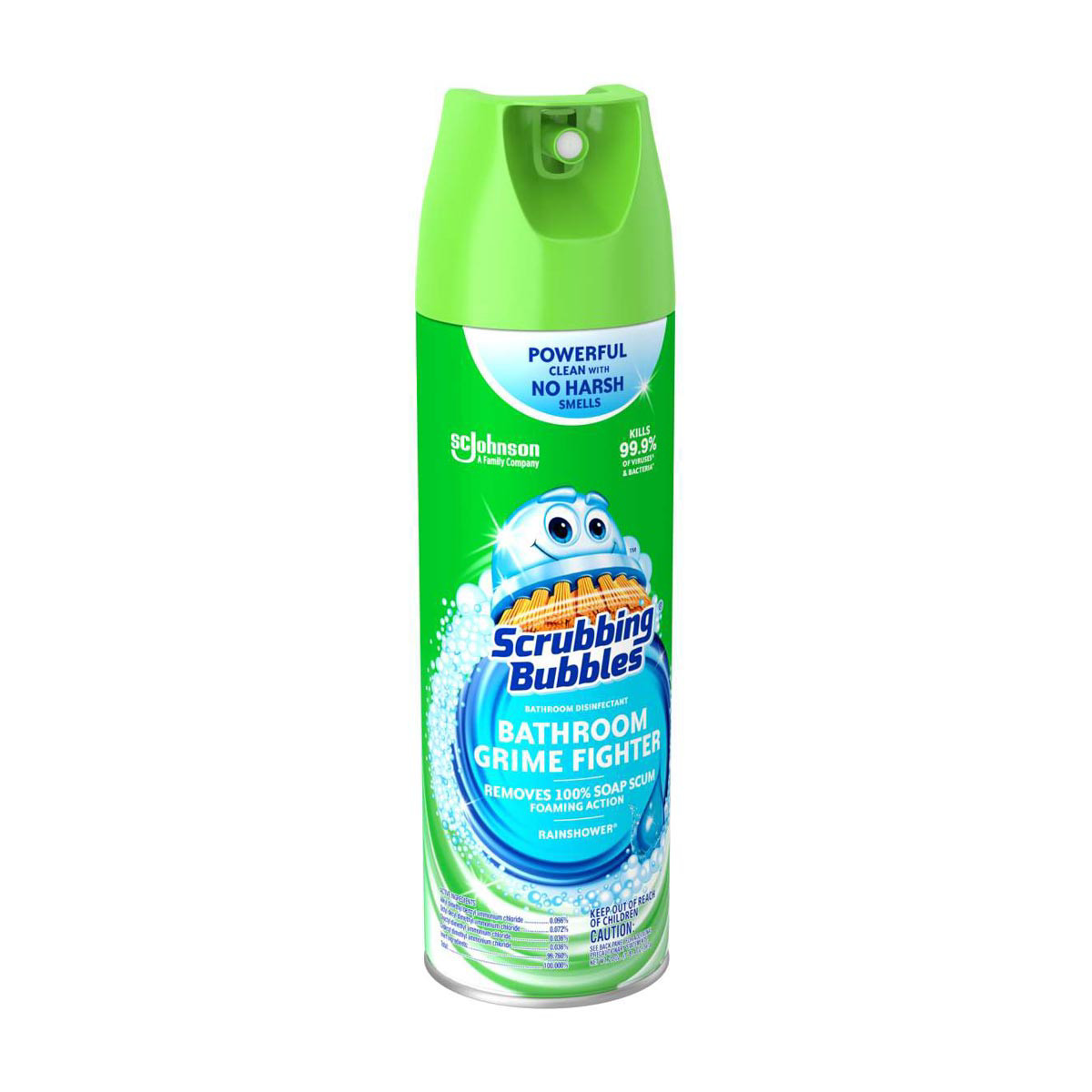 - Scrubbing Bubbles Bathroom Grime Fighter Aerosol is a disinfectant cleaner with a penetrating foam that takes on grime wherever it hides and kills 99.9% of viruses and bacteria*