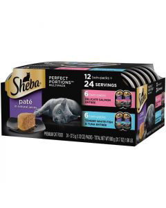 - Contains twelve (12) 2.6 oz. perfect portions twin pack trays (24 servings total) of Sheba Wet Cat Food Pat Variety Pack: (6) Delicate Salmon Entre, (6) Tender Whitefish & Tuna Entre