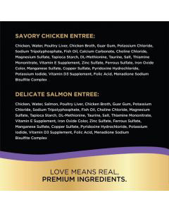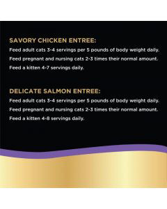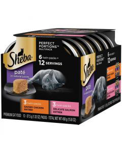 - Contains six (6) 2.6 oz. PERFECT PORTIONS twin pack trays (12 servings total) of SHEBA Wet Cat Food Pat Variety Pack: (3) Savory Chicken Entree, (3) Delicate Salmon Entree