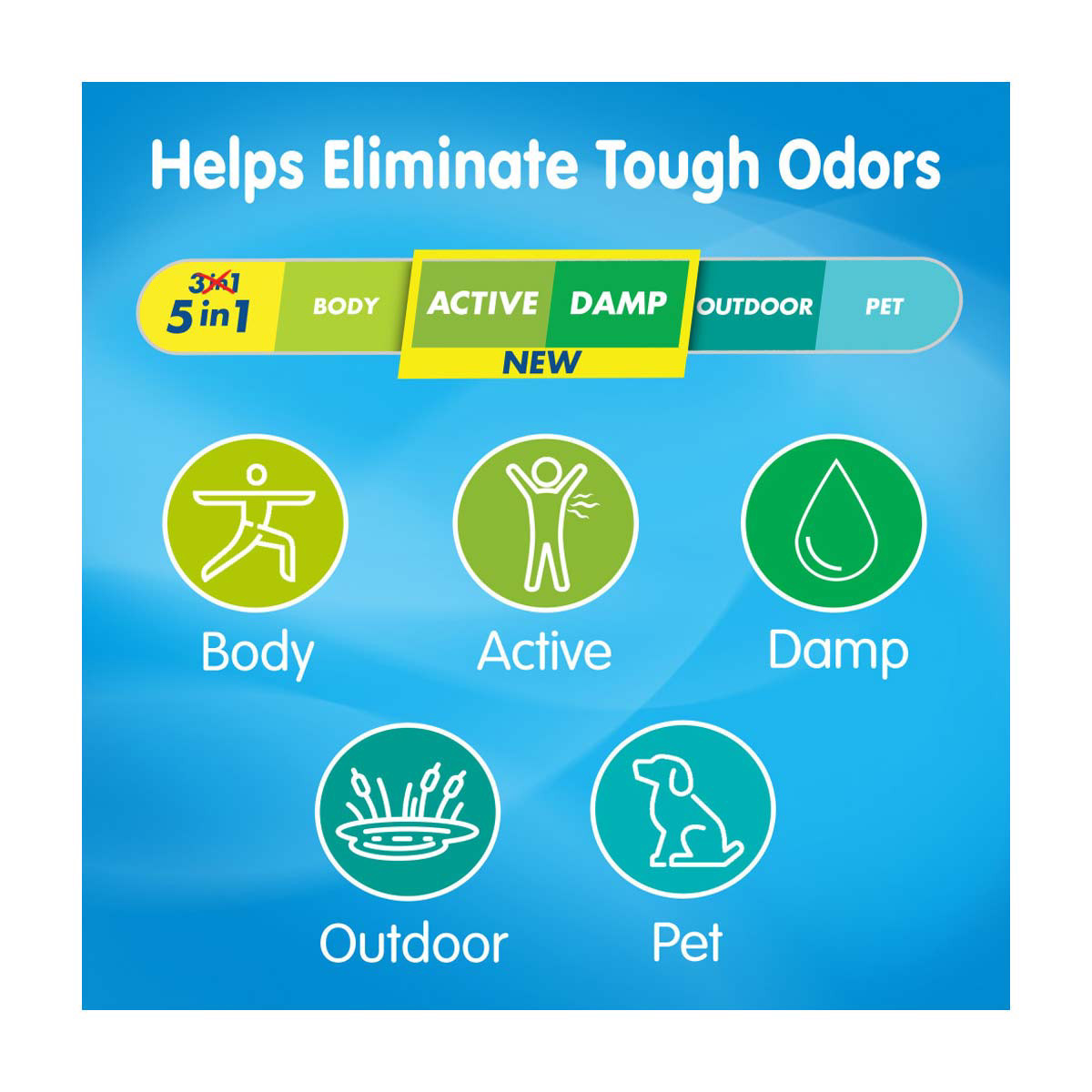 - 5in1 Odor elimination to help fight body, active, damp, outdoor, and pet odors