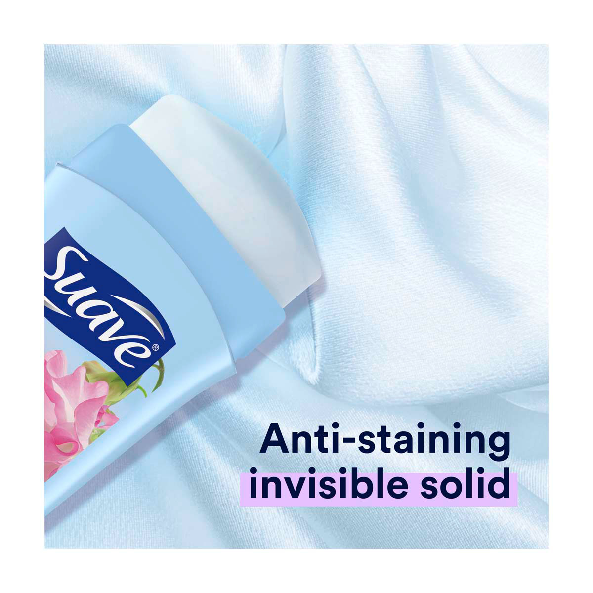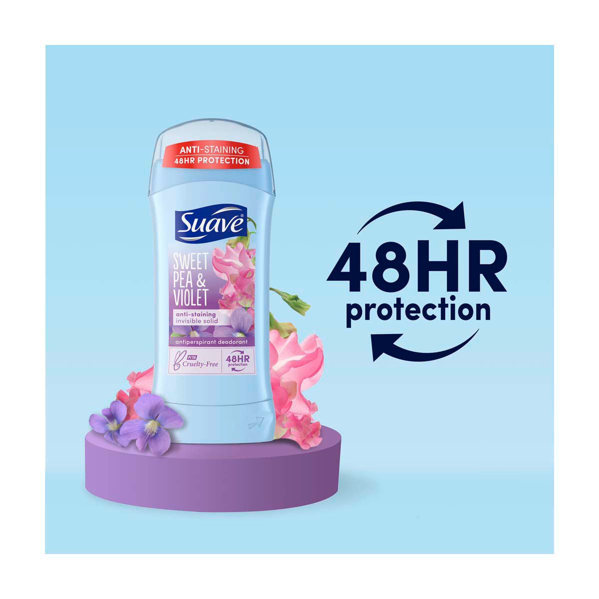 - Suave Sweet Pea & Violet Invisible Solid deo and antiperspirant stick is anti-staining and protects for 48 hours.