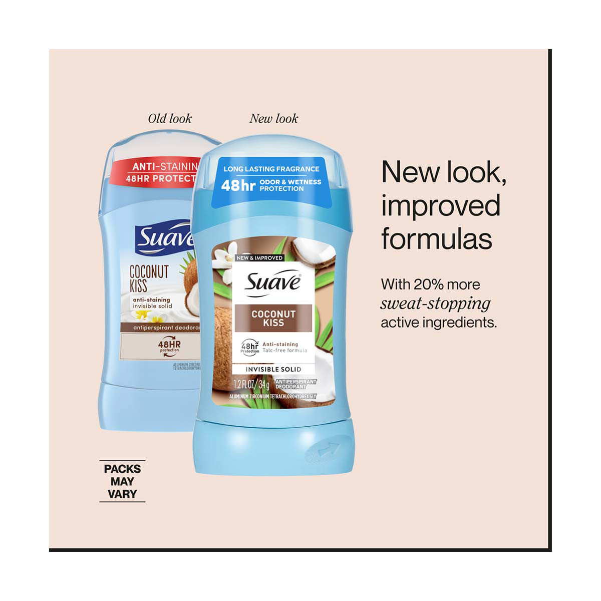 - IMPROVED FORMULA: Suave Women's Antiperspirant Deodorants now with 20% more sweat-stopping ingredients compared to our original formulation last longer, work harder, and are tough on sweat but gentle on skin, providing comfortable protection