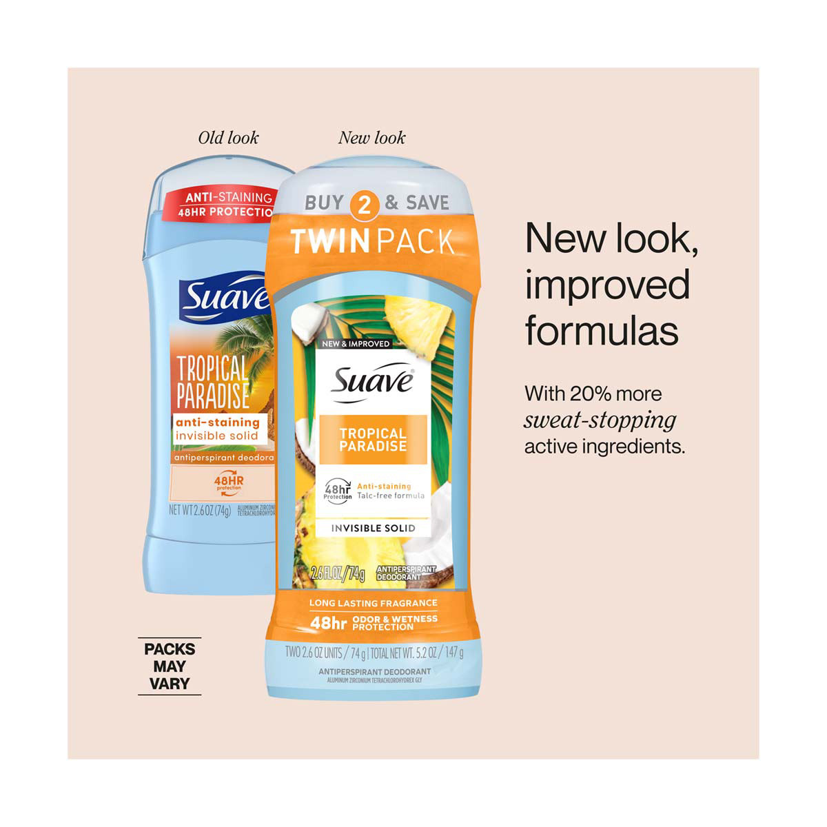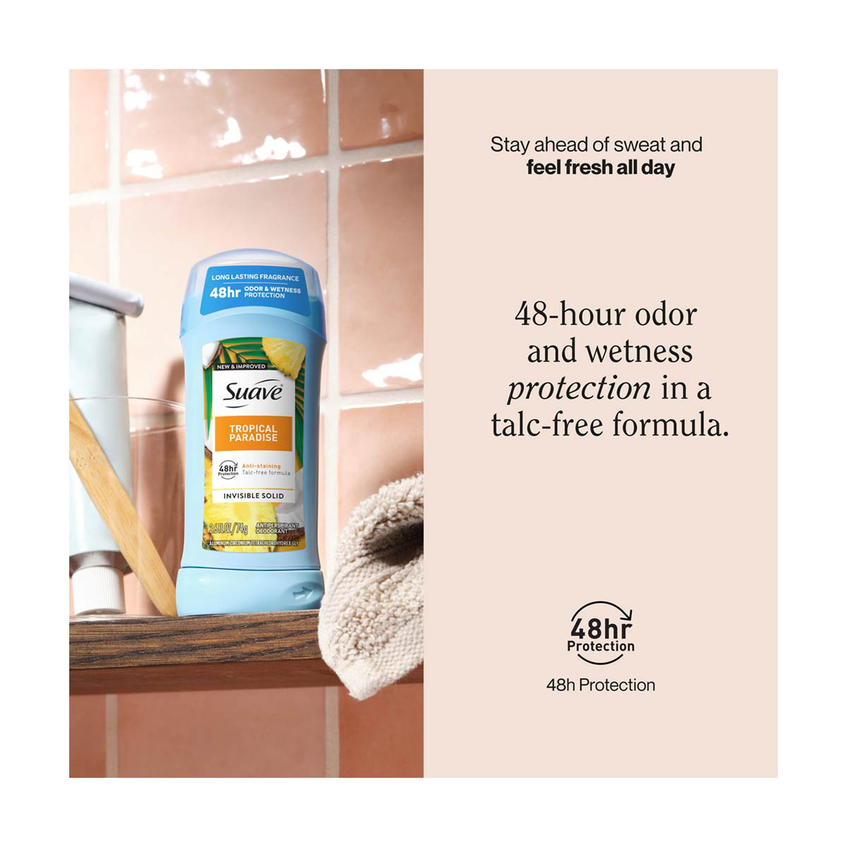 - LONG-LASTING FRAGRANCE: The long-lasting Suave Tropical Paradise fragrance keeps you feeling fresh all day with notes of peach, passion fruit, coconut, and vanilla and its 2.6 oz size is ideal for travel or on-the-go use, making it easy to keep this underarm deodorant handy wherever you are