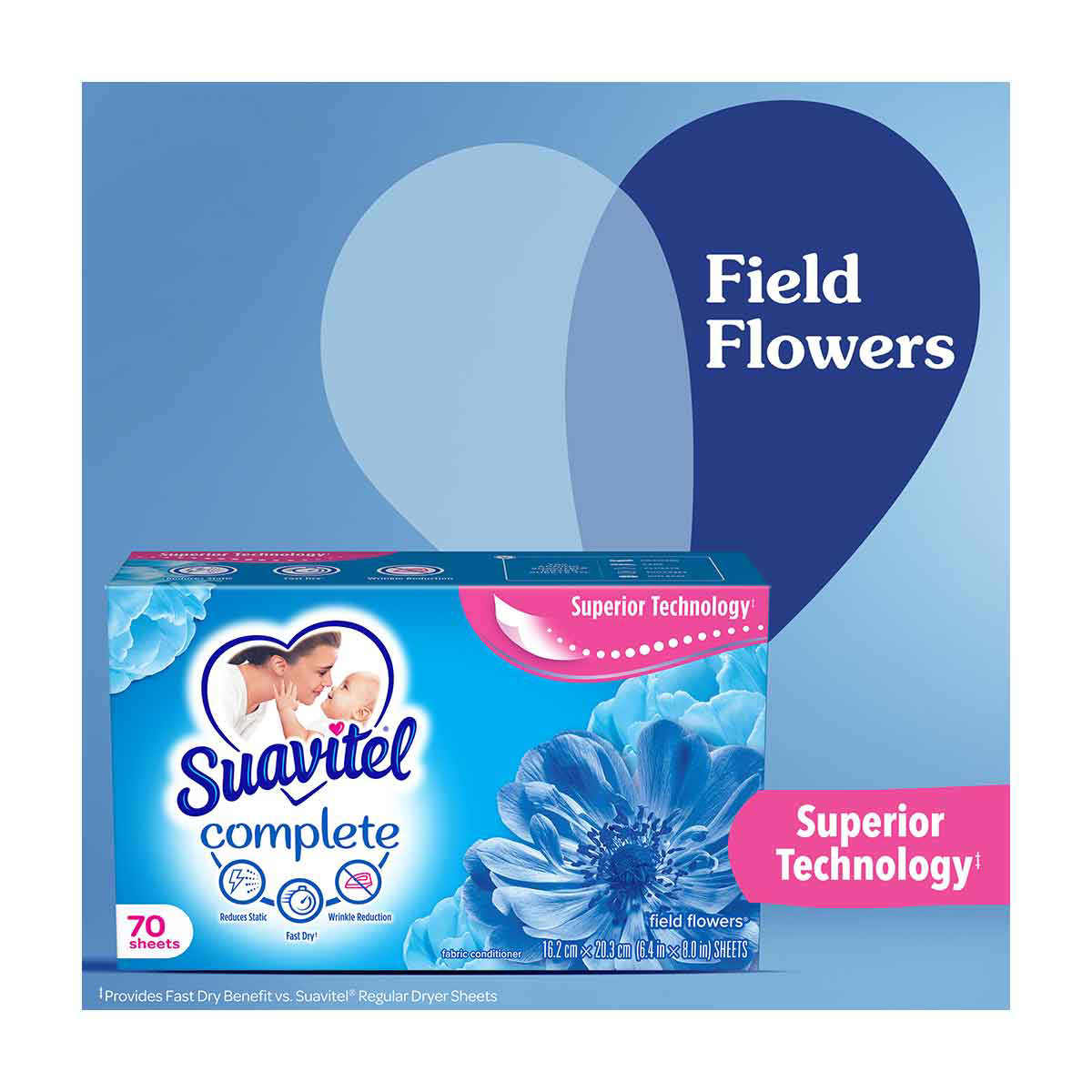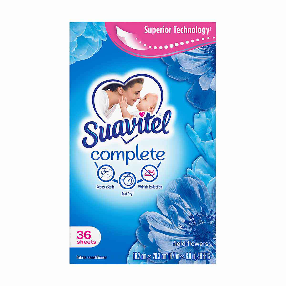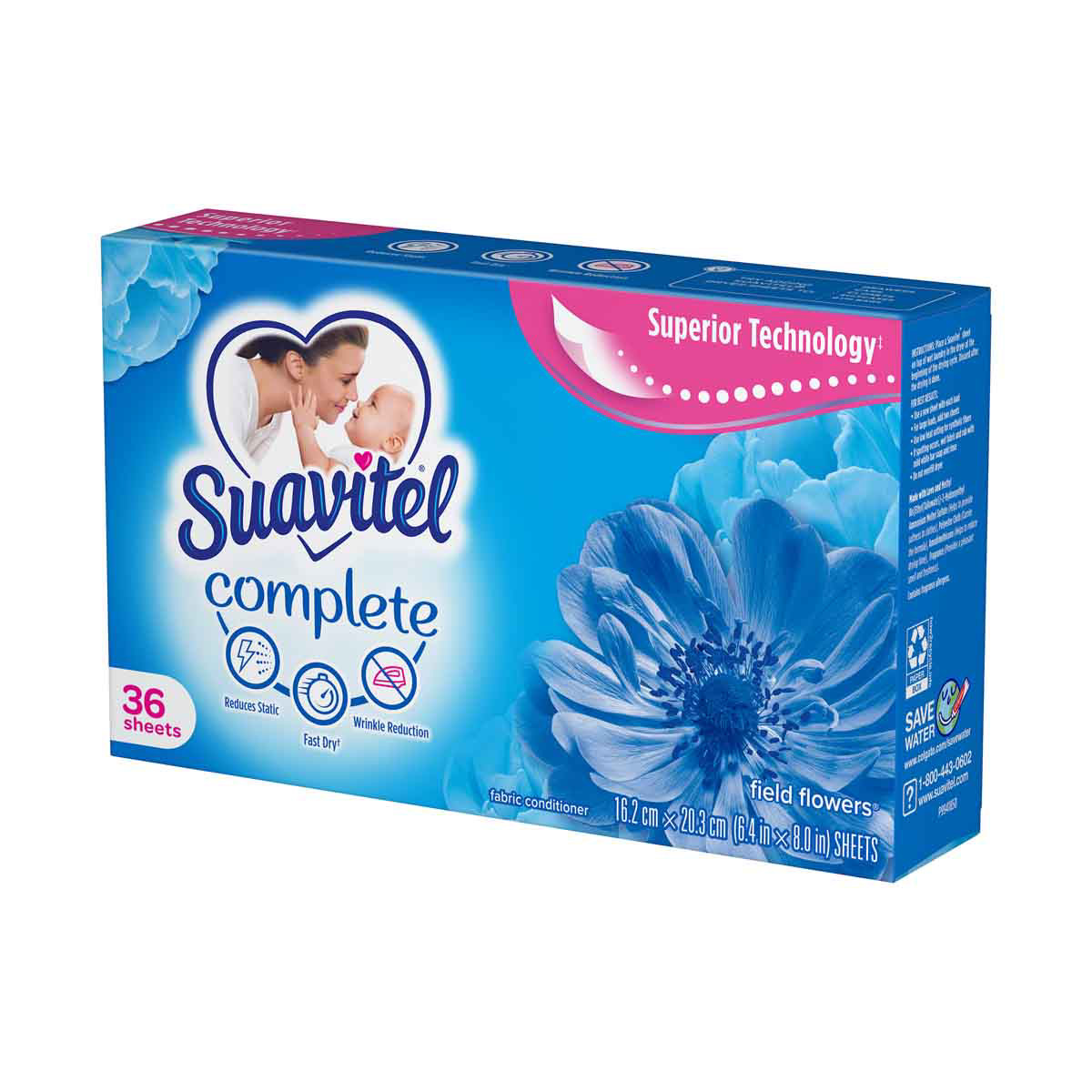 - One 36 count box of Suavitel Complete Dryer Sheets, Fabric Conditioner, Field Flowers Scent