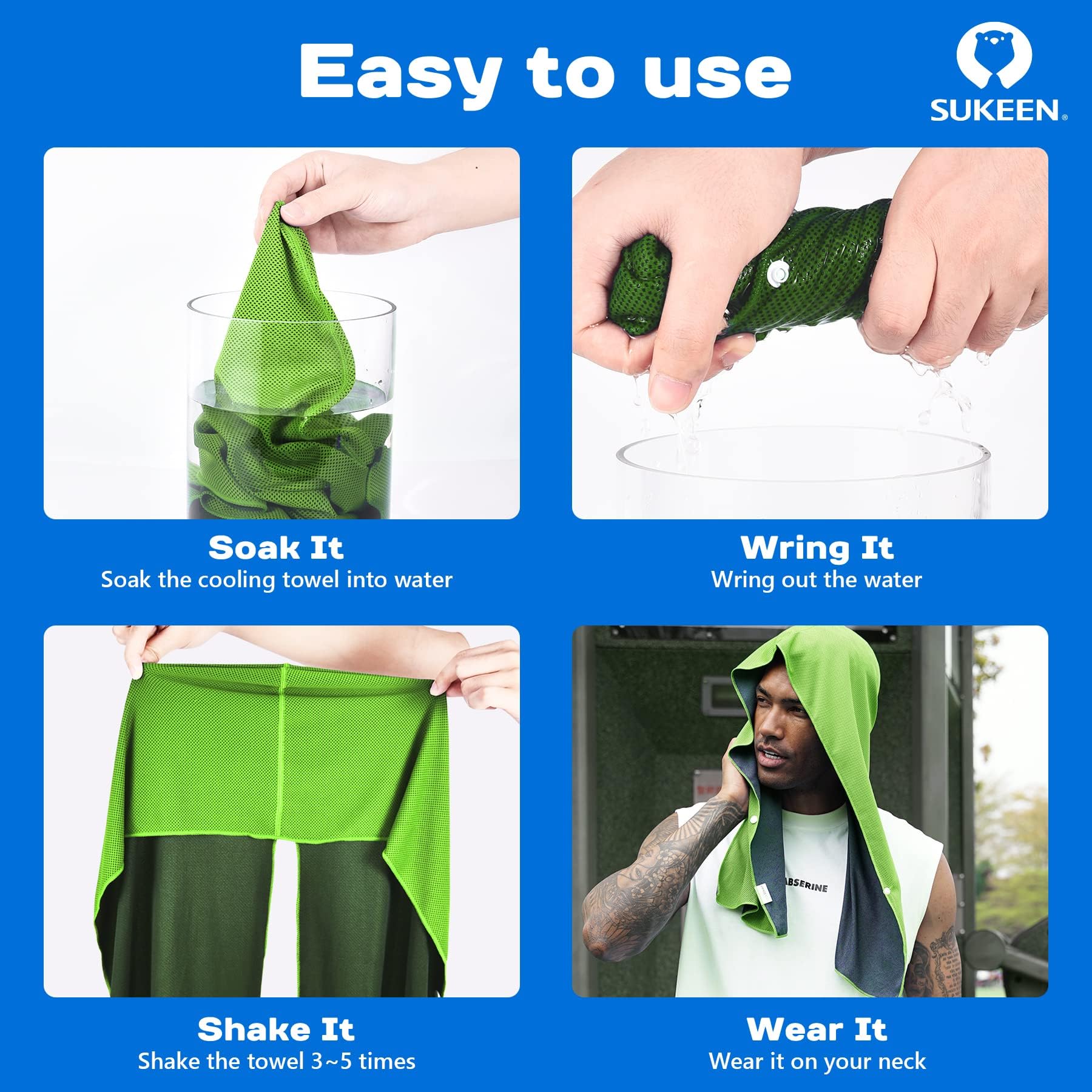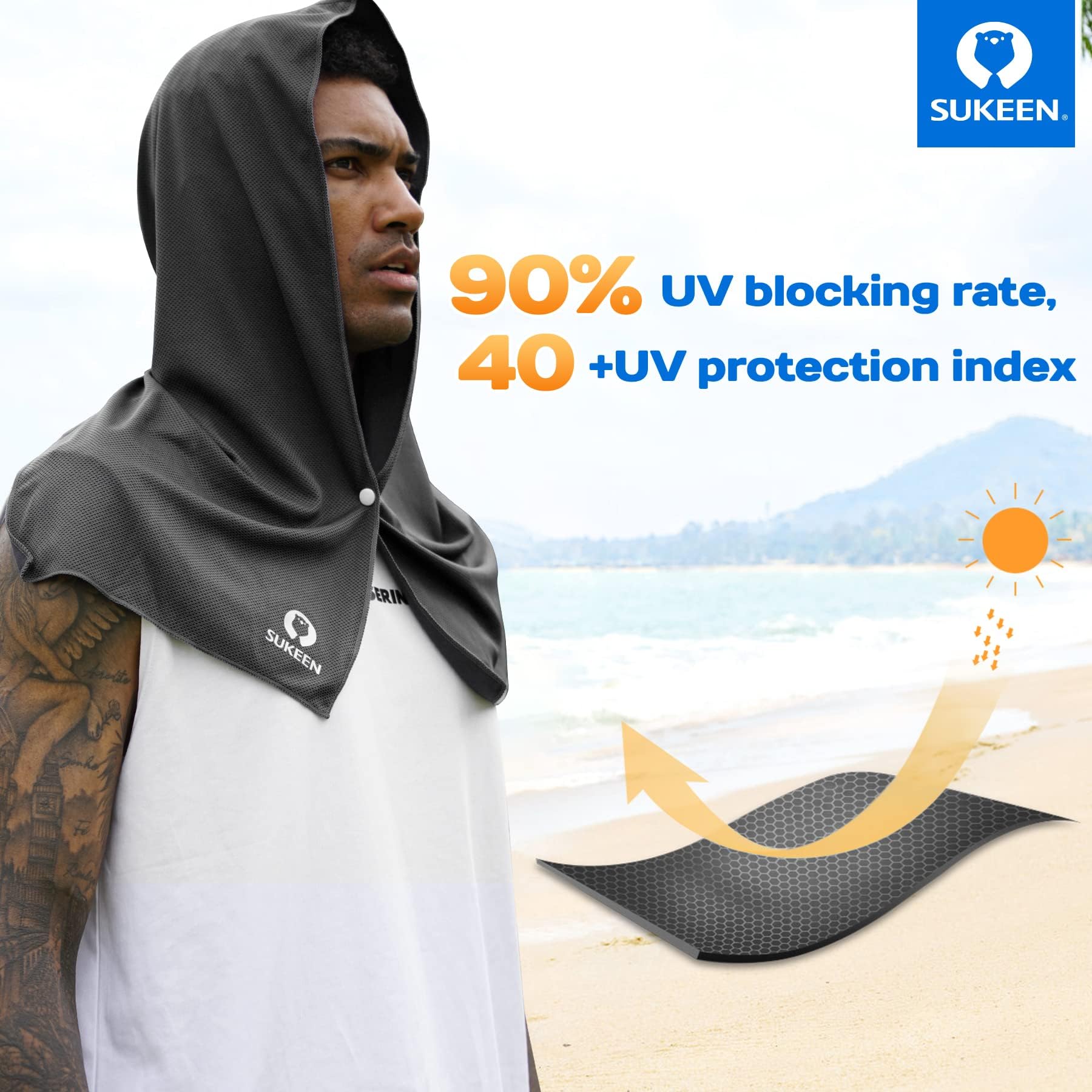 - INSTANT COOLING & REUSABLE TOWEL: The unique cooling system uses moisture from the towel to draw the sweat away from your skin to keep you cool, now Sukeen Cooling Hoodie Towel protects your skull from harmful UVA and UVB rays and sweat keep away from your eyes.