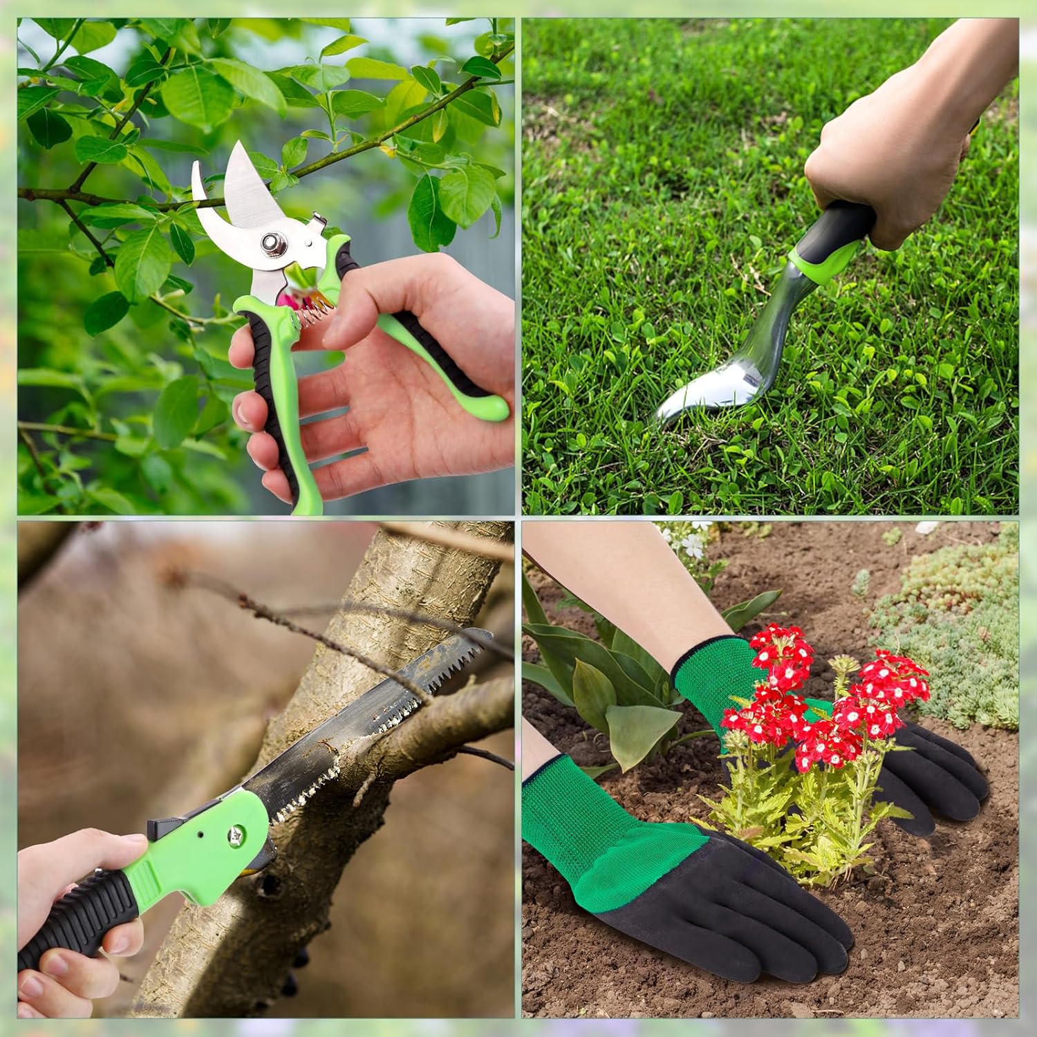 - Meet All Your Needs: These tools will help you with digging, weeding, raking, loosening, aeration, transplanting, sawing and pruning for all your indoor and outdoor gardening needs. The pruning shears are sharp enough to cut thicker branches.