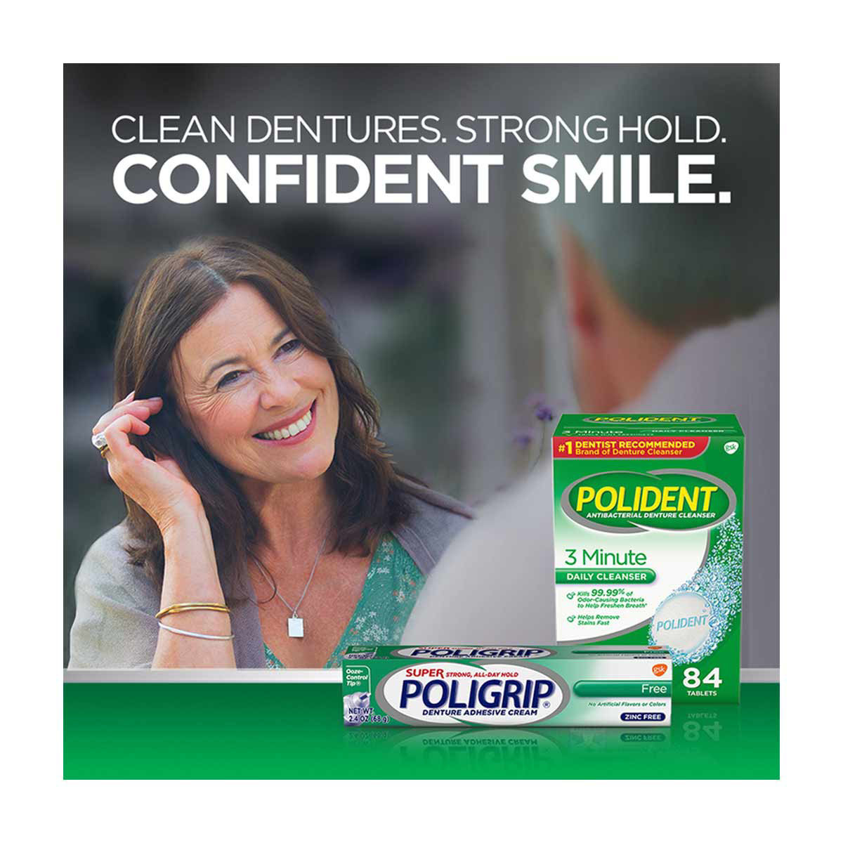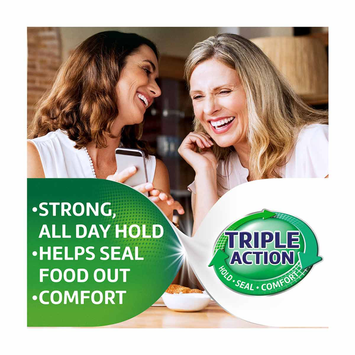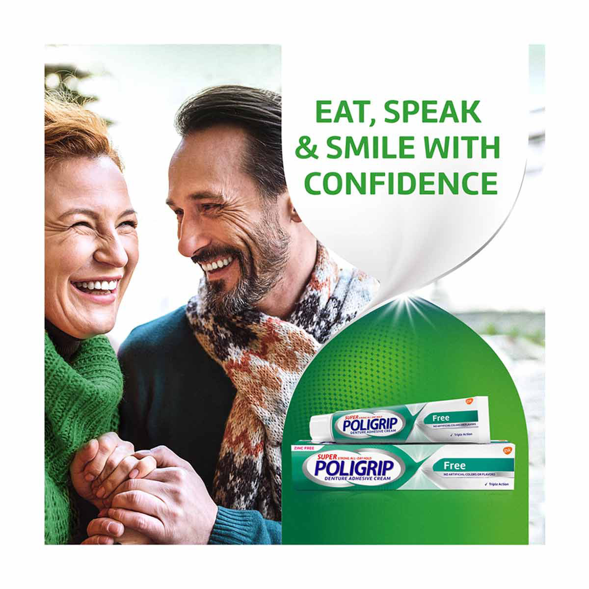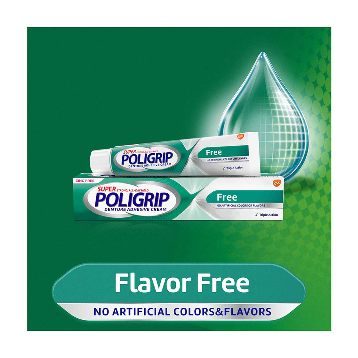 - Super Poligrip Free Denture Adhesive Cream offers a strong 12 hour hold that seals out up to 74 percent more food particles (versus no adhesive after 1 hour on a lower full denture)