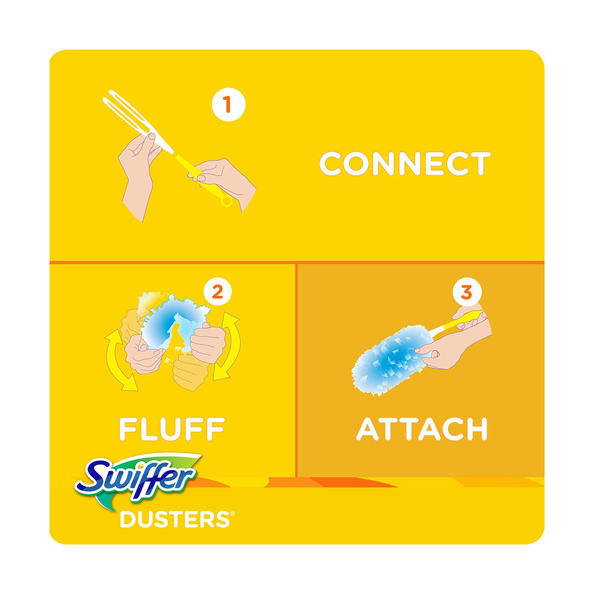- Swiffer Dusters have specially coated fibers that reach deep into nooks and crannies to grab, trap and lock dust