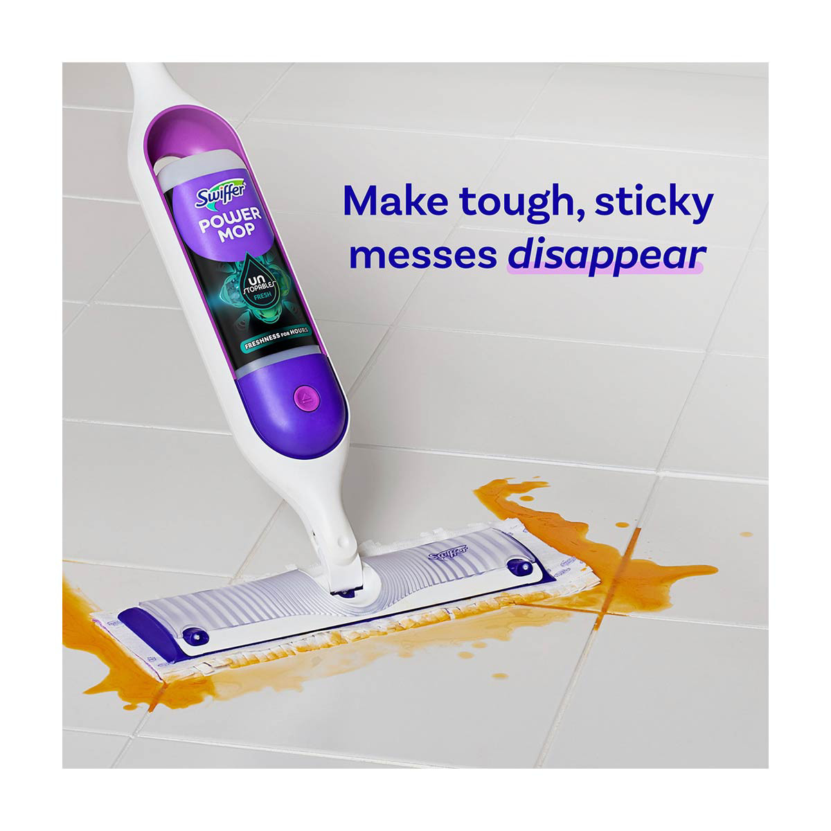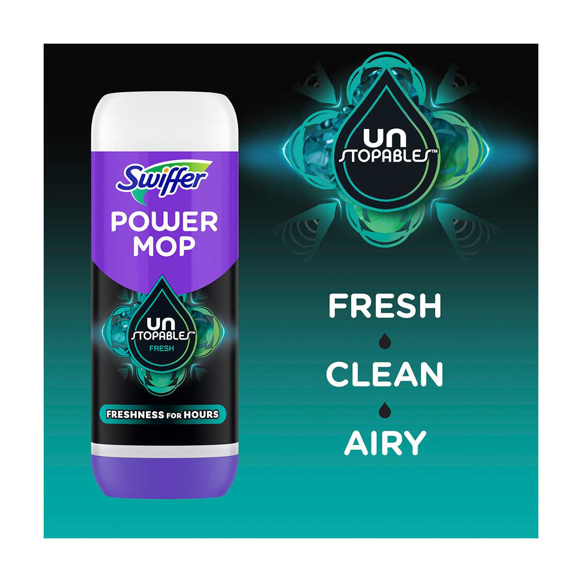 - Includes 1 25.3 fl oz bottle of Swiffer PowerMop Floor Cleaning Solution, Unstopables Fresh Scent