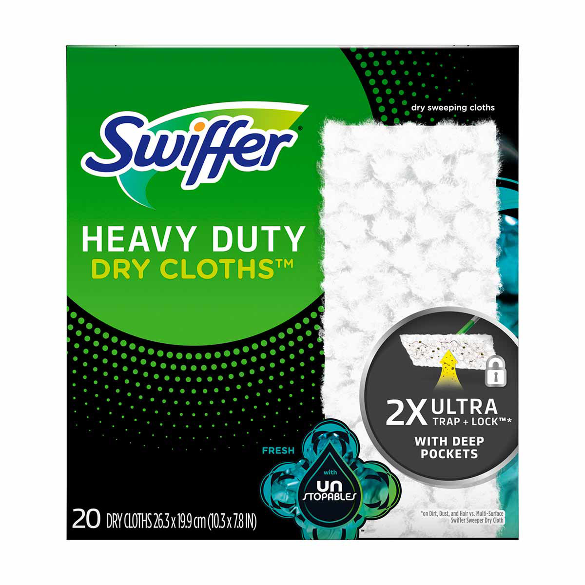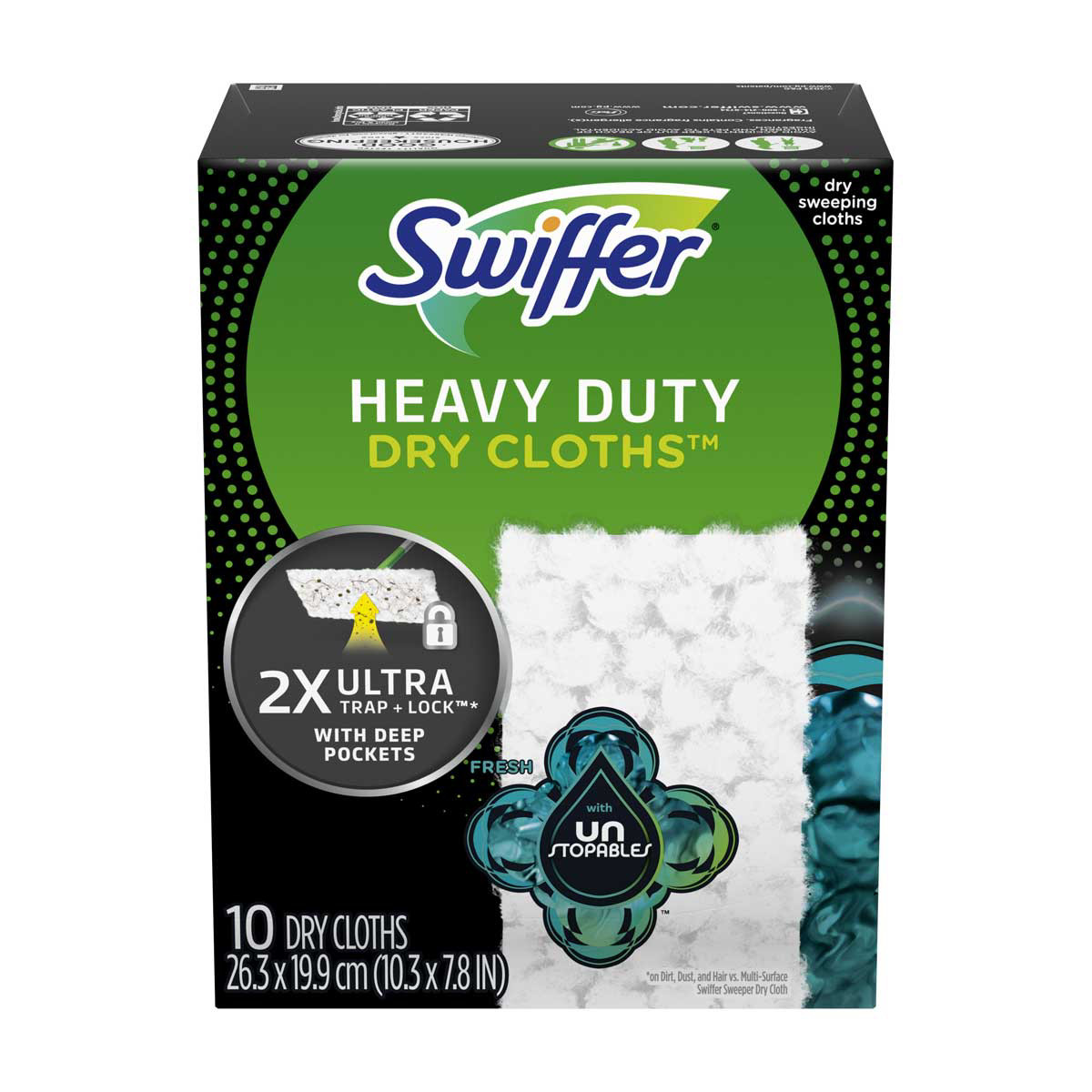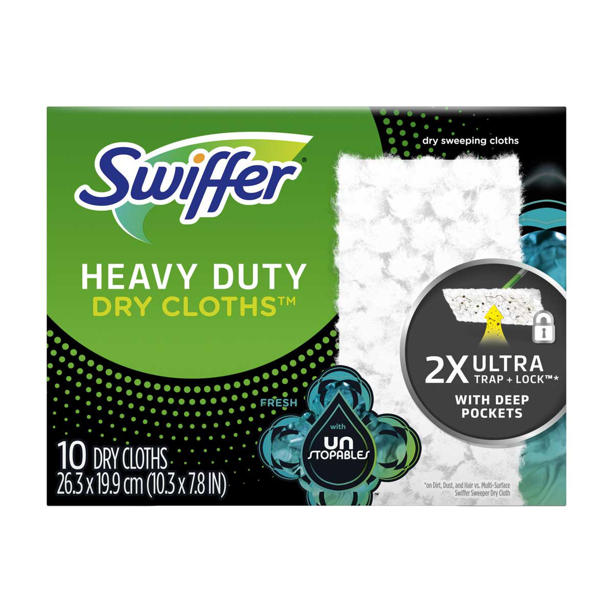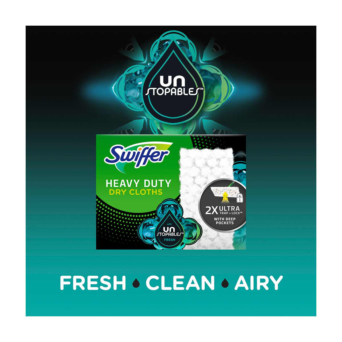 - Enjoy the Lasting Freshness* of Swiffer Heavy Duty Dry Sweeping Cloths with Unstopables Fresh Scent. Swiffer’s newest scent is bright and vibrant, finished with airy and crisp undertones.*Leaves behind up to 1 hour of freshness after initial product use