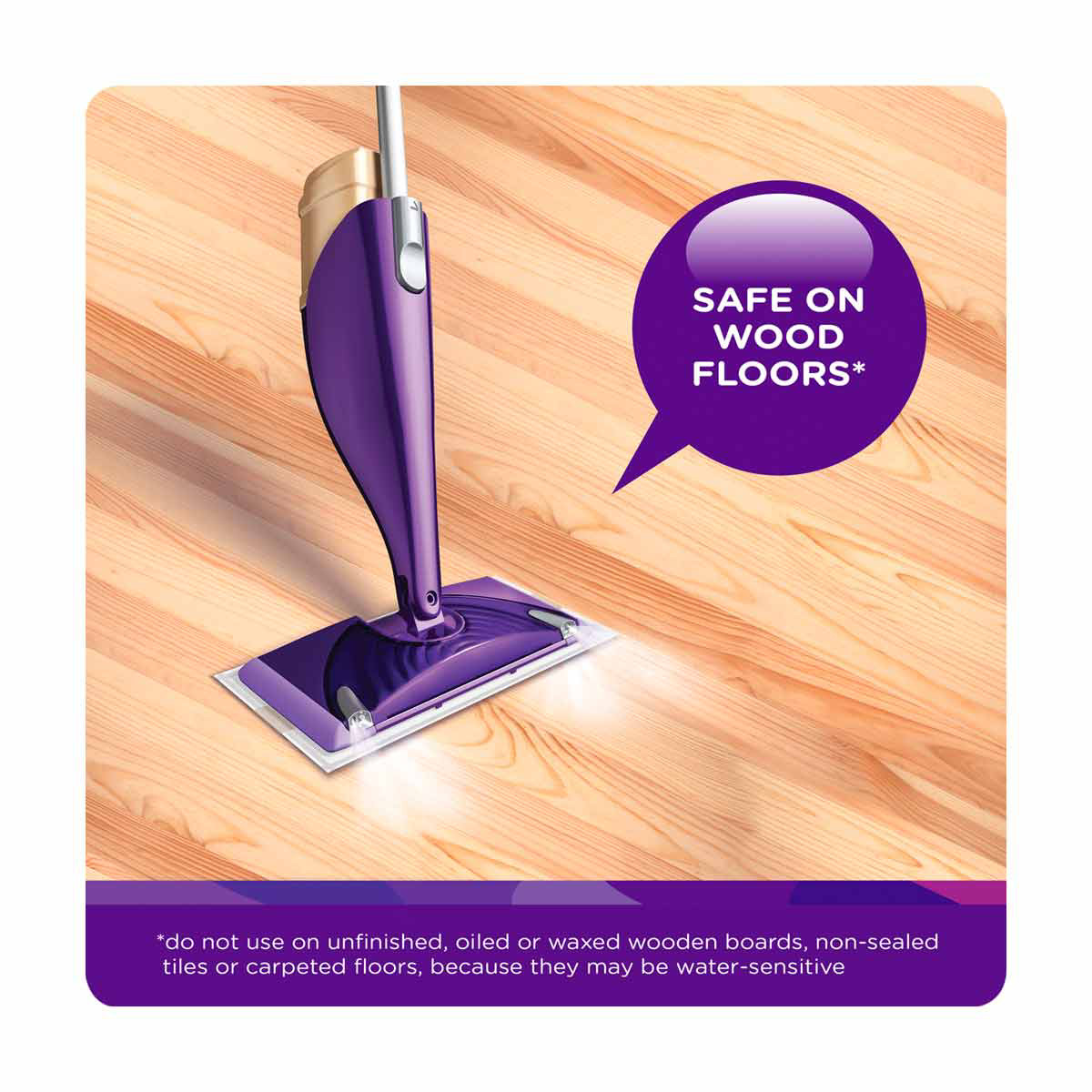 - Safe on wood *do not use on unfinished, oiled, or waxed wooden boards, non-sealed tiles, or carpeted floors because they may be water sensitive