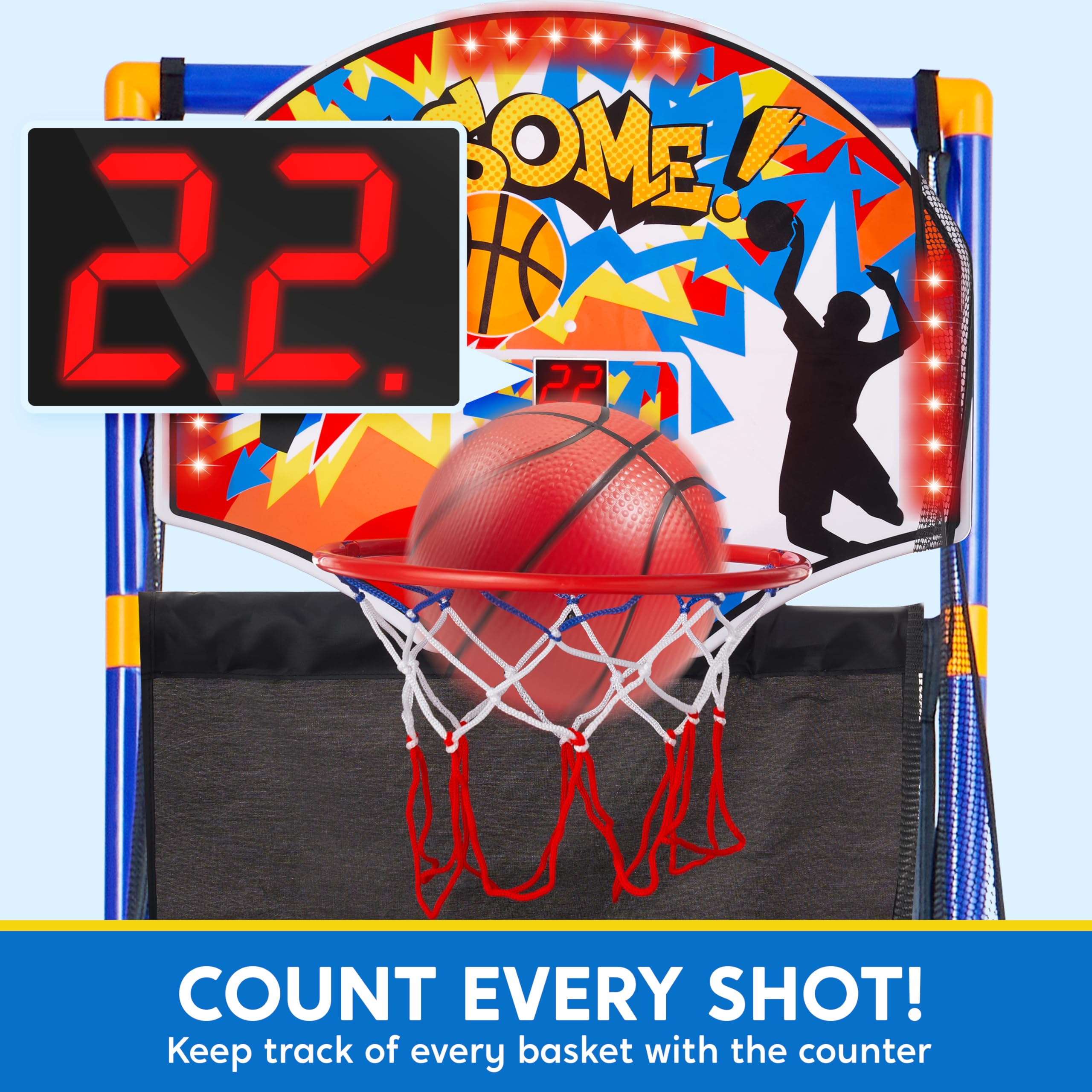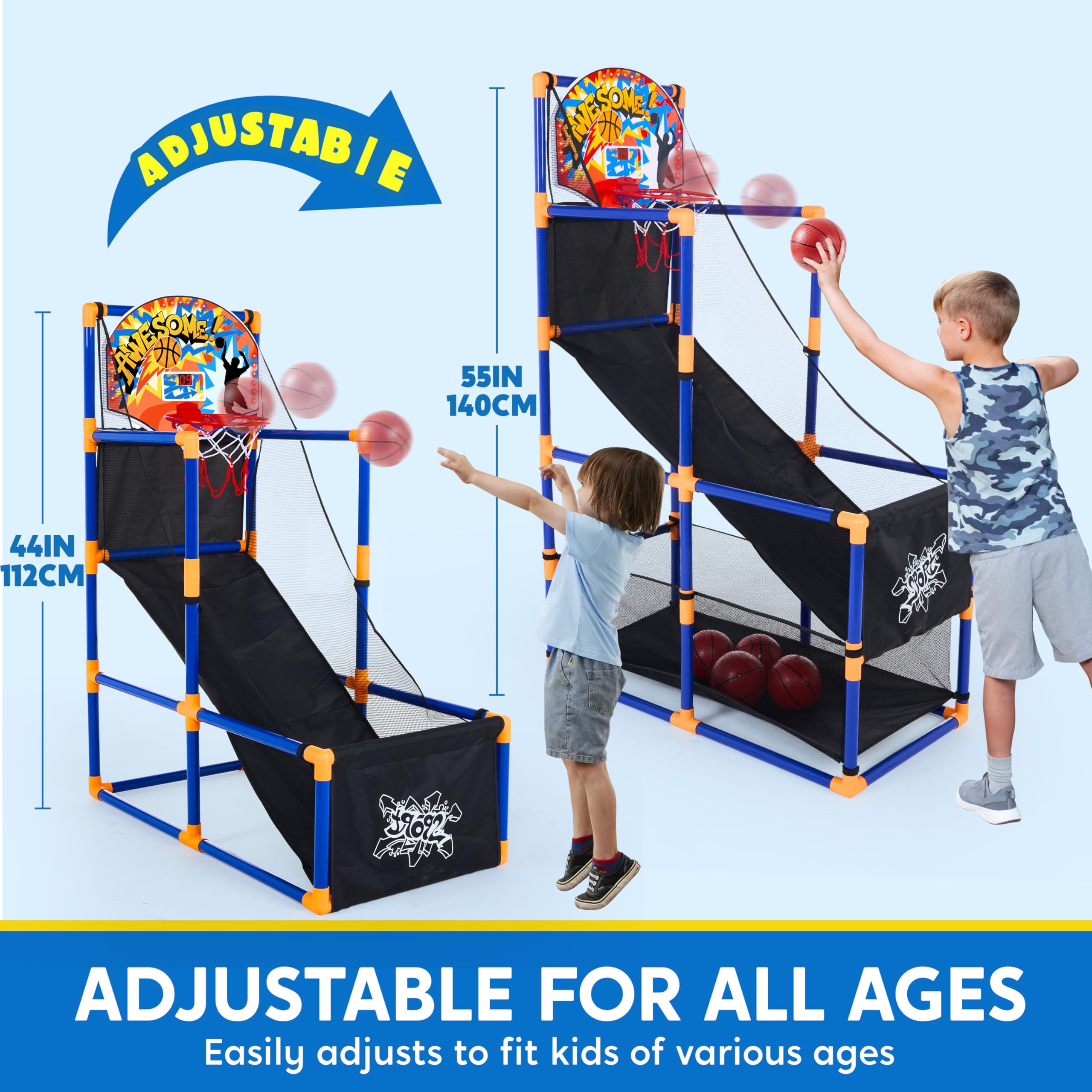 - Super Value Set: This basketball arcade game includes a complete basketball stand, 4 inflatable basketballs, and 1 air pump, all made from durable plastic for long-lasting fun.