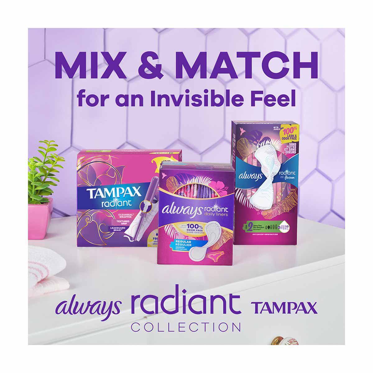 • Tampax Radiant tampons provide up to 100% leak and odor-free protection
