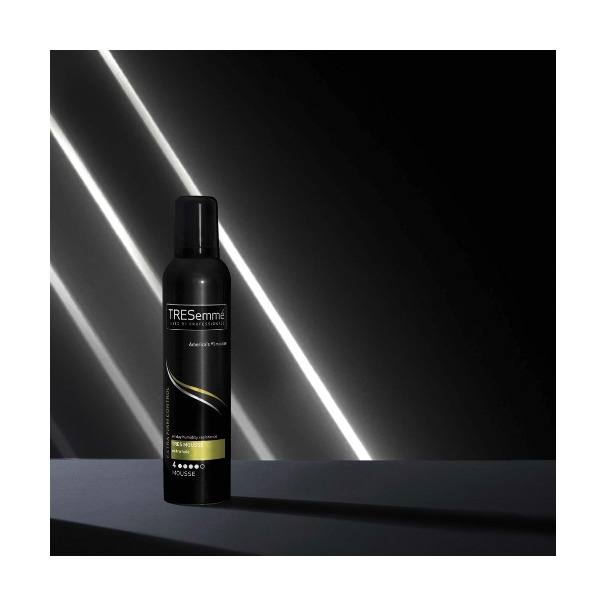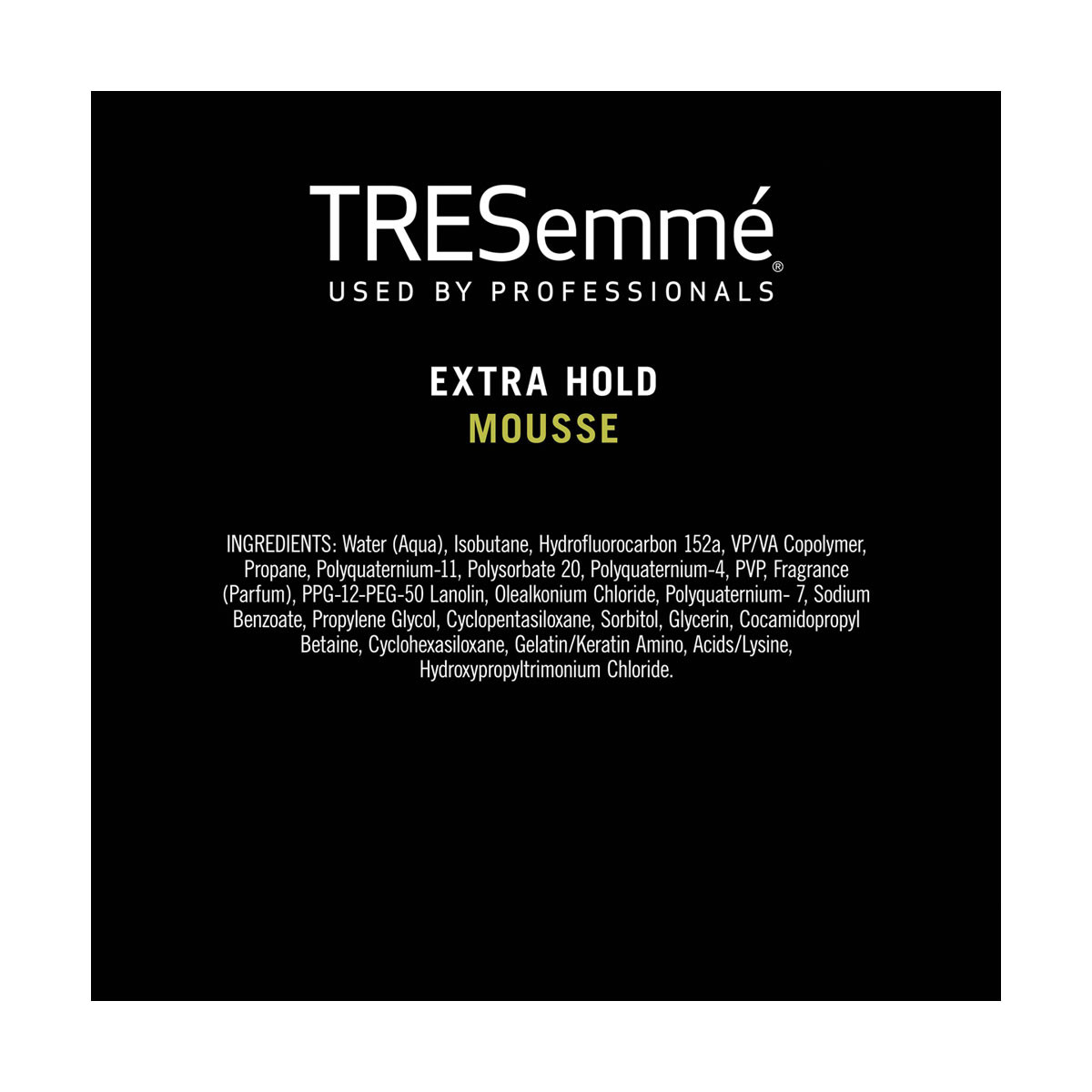 - EXTRA HOLD FORMULA: TRESemmv© Extra Hold Hair Styling Mousse is an alcohol-free hair mousse formulated with holding isopolymers for maximum hold and control.NO STIFFNESS: This ultra-light volumizing mousse helps secure the voluminous hairstyle you want without stiffness or stickiness.FLEXIBLE STYLES: With our extra firm volumizing mousse, your hairstyles will be in control, flexible, and beautifully full.TREND LED, RIGOROUSLY TESTED: Every ingredient in this mousse is selected to ensure your hair receives the best possible care. We do not test on animals and our hair products are PETA-approved.EXPERT TIP: Towel-dry hair, shake can, and dispense 2-3 egg-sized dollops. Spread mousse evenly on damp hair from roots to ends. Blow dry and style as desired.DO IT WITH YOUR STYLE: With professional quality hair products, like our Extra Hold Mousse, a world of style possibilities is yours to achieve with TRESemmv©.