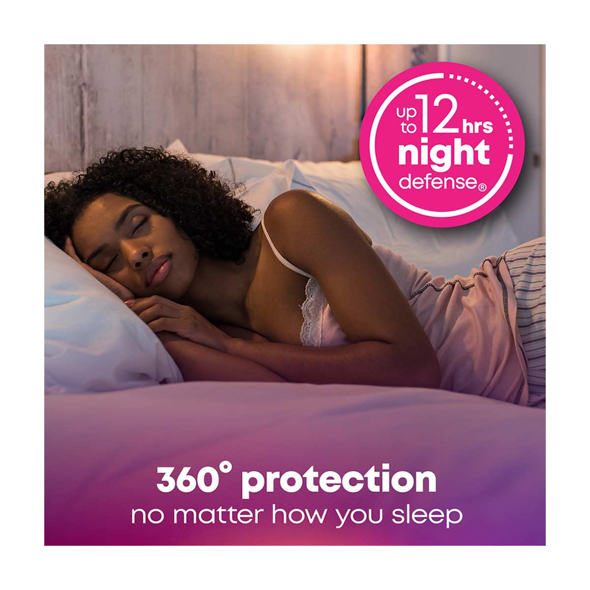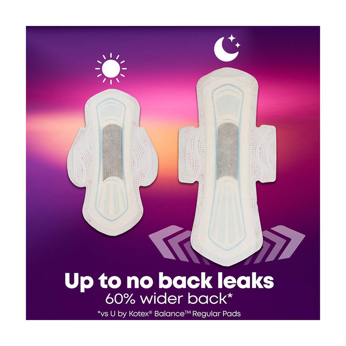- Up to 100% Leak Free: The raised center of these pads with wings absorbs quickly for up to 100% leak free protection while providing outstanding skin comfort. Larger Back and Front: Each overnight absorbency pad comes with a larger front and 60% larger back** for up to zero front, side or back leaks (**vs. U by Kotex Balance Regular Absorbency Pads),12 Hours of Night Defense: Our nighttime period pads provide up to 12 hours of night defense for worry-free sleep