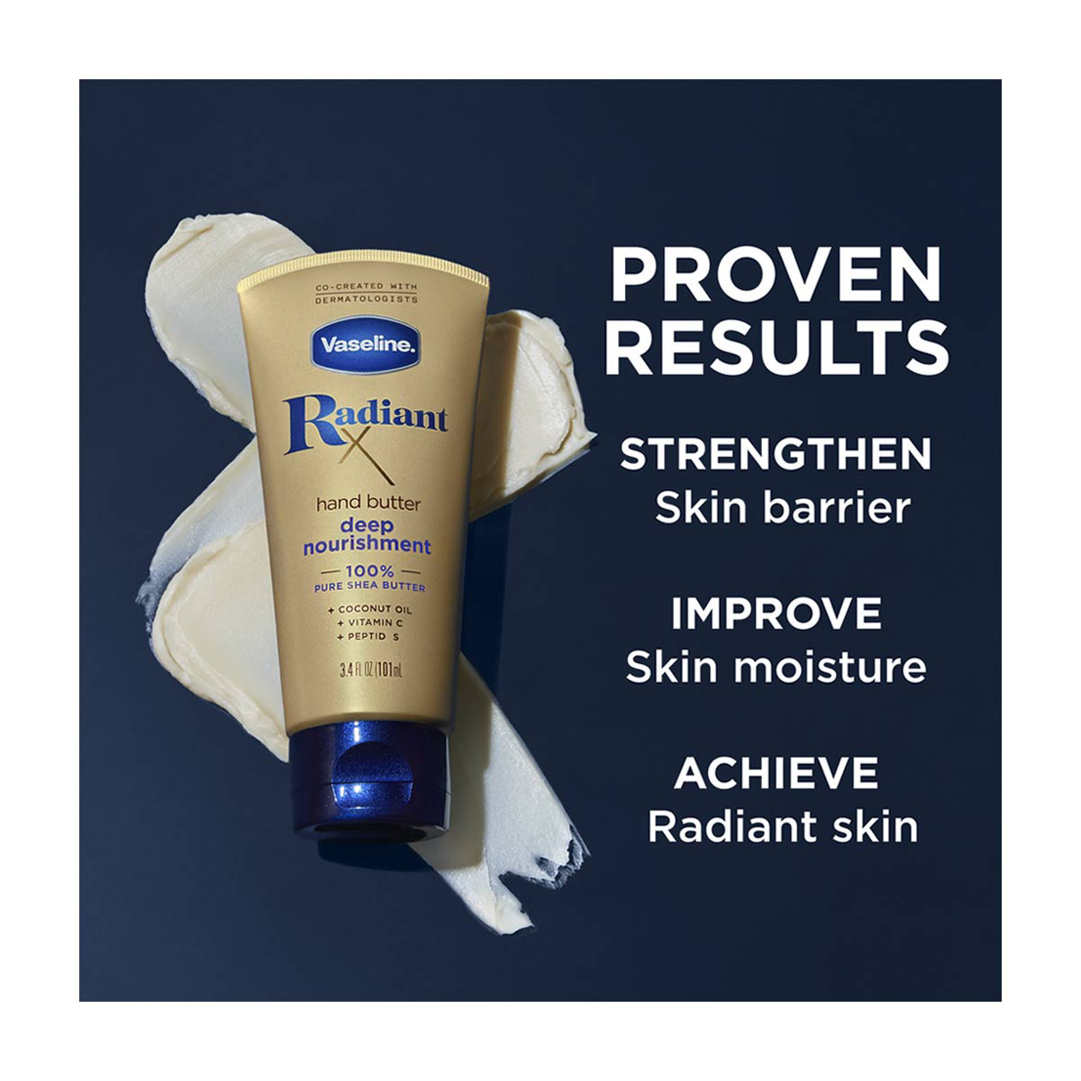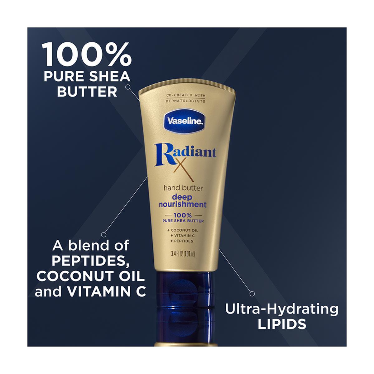 - POWERED BY SCIENCE: Vaseline Radiant X Deep Nourishment Hand Butter contains 100% pure shea butter, coconut oil, vitamin C, peptides and ultra-hydrating lipids that fortify the skin barrier.