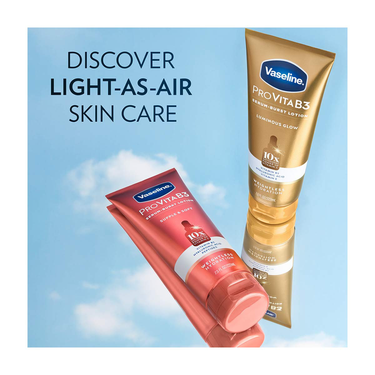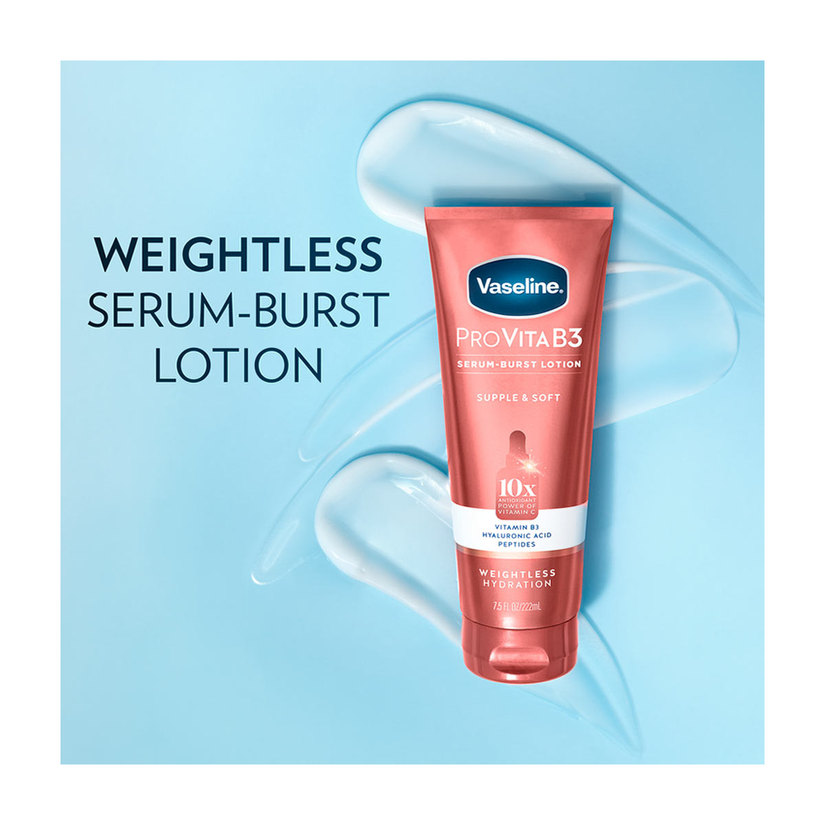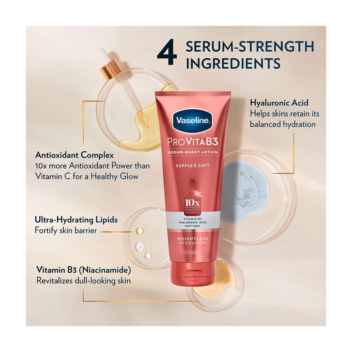 - Vaseline Pro VitaB3 Serum Burst Lotion, with 10x the antioxidant power of vitamin C from our Antioxidant Complex, helps revitalize dull-looking skin for a healthy glow.