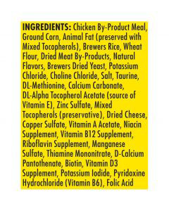 - Chicken By-Product Meal, Ground Corn, Animal Fat (preserved with Mixed Tocopherols), Rice, Dried Meat by-Products, Wheat Flour, Natural Flavors, Corn Gluten Meal, Potassium Chloride, Choline Chloride, Salt, Calcium Carbonate, Taurine, DL-Methionine, Vitamins (dl-Alpha Tocopherol Acetate [Source of Vitamin E], Vitamin A Acetate, Niacin Supplement, Vitamin B12 Supplement, Riboflavin Supplement, Thiamine Mononitrate, d-Calcium Pantothenate, Vitamin D3 Supplement, Biotin Supplement, Pyridoxine Hydrochloride [Vitamin B6], Folic Acid Supplement), Minerals (Zinc Sulfate, Copper Sulfate, Manganese Sulfate, Potassium Iodide), Dried Cheese