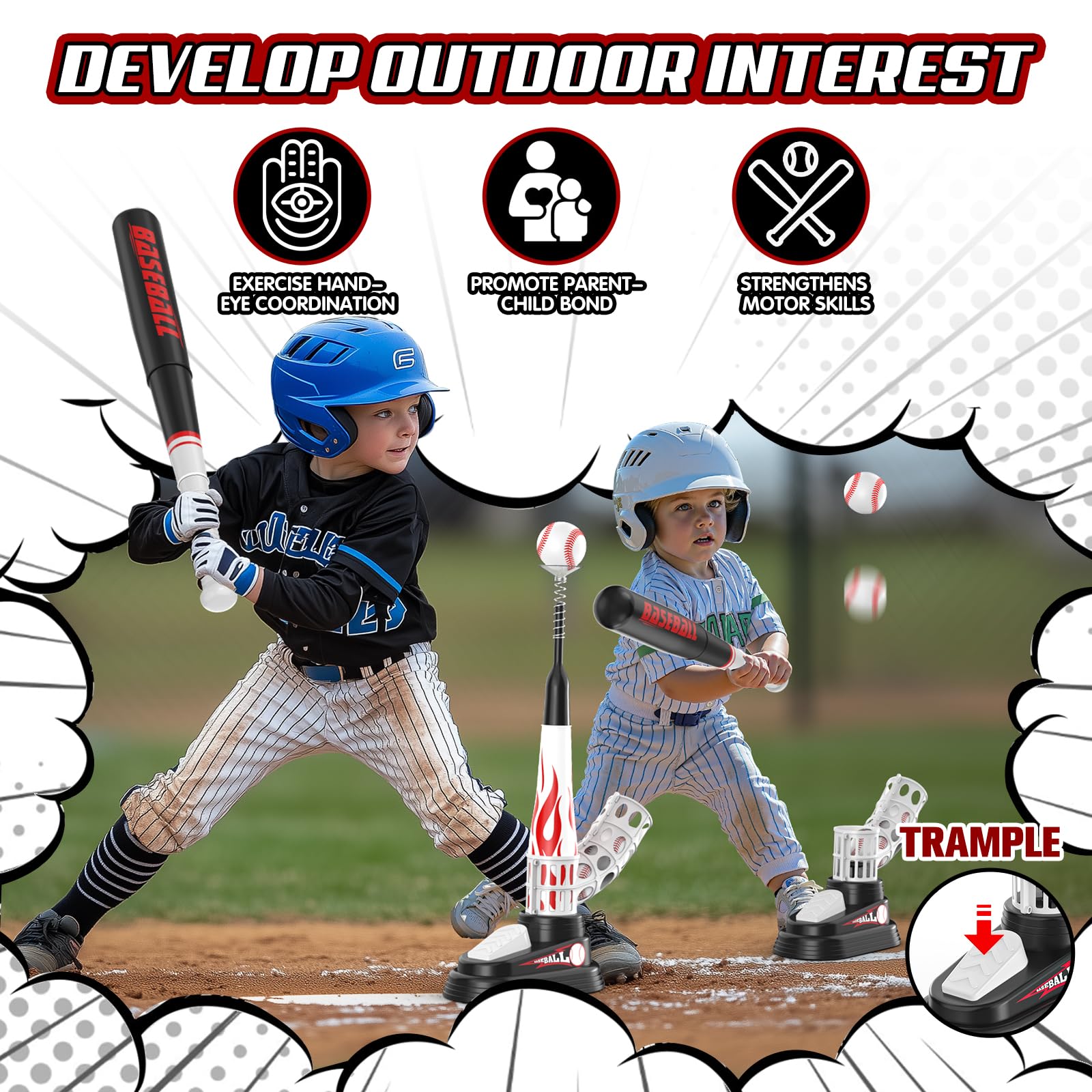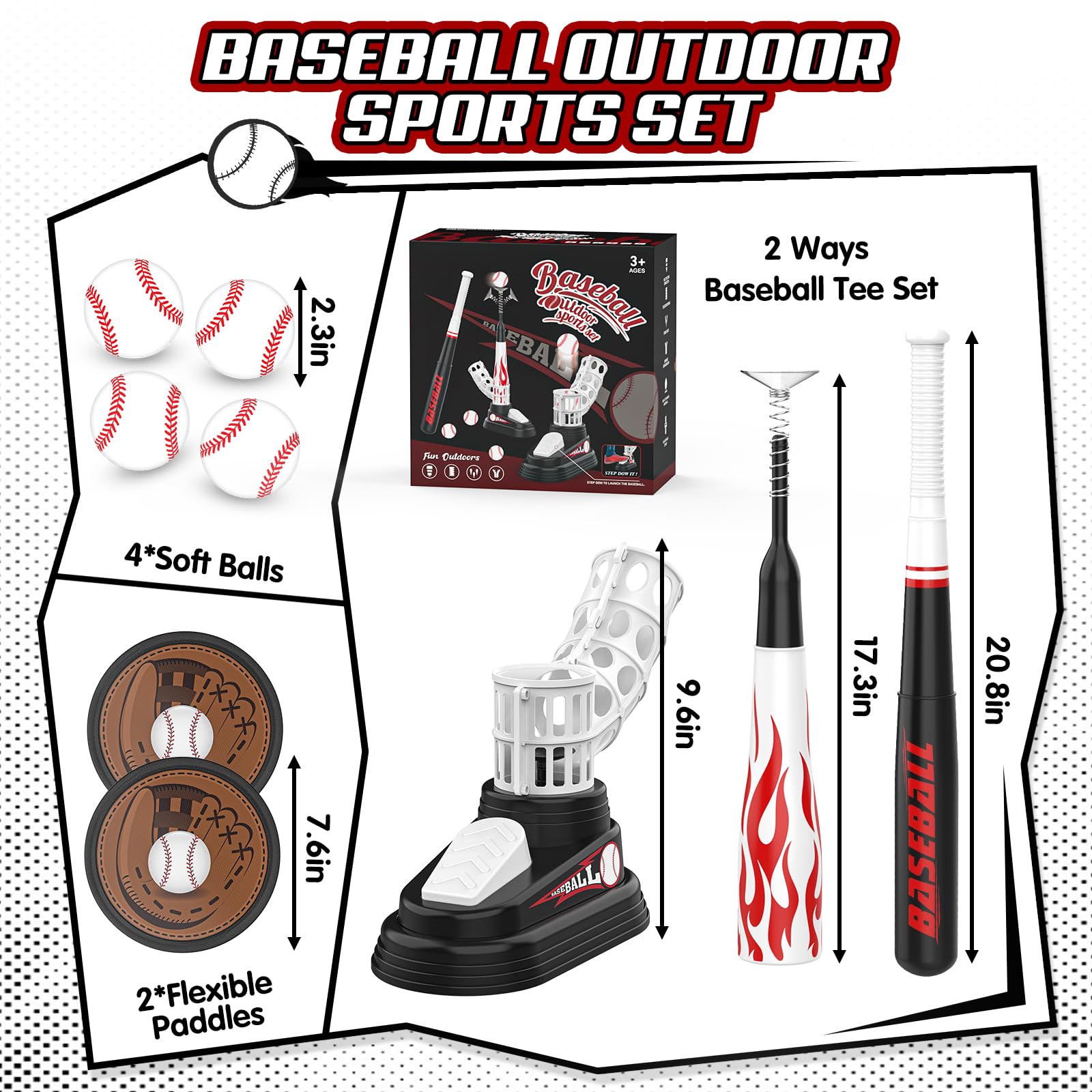 - Surprise Gift for Kids: This t ball tee toy has a unique design with a flame-shaped print and cool stickers that will keep your kids entertained for hours on end. Not only be used as birthday gifts, Christmas gifts or party gifts, but also can be used as indoor and outdoor educational toys for ages 3-5 5-7. If you have any concerns or questions, please contact with us at any times and we will provide a satisfactory solution
