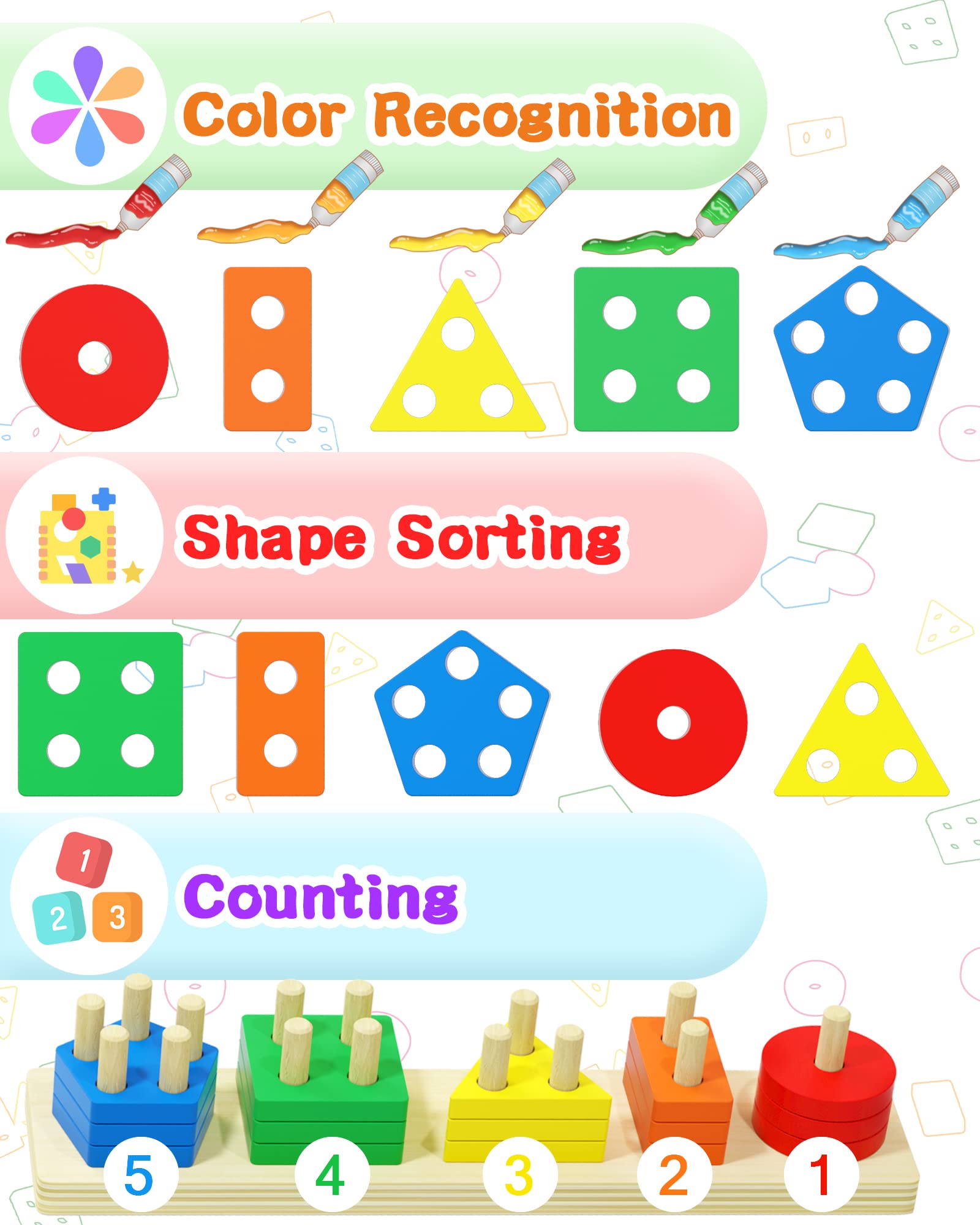 - LEARNING THROUGH PLAY: This wooden sorting and stacking puzzle contains 20 pieces including blocks of 5 colors and 4 geometric shapes.It feeds the developing minds of young kids, helping them practice fine motor skills, hand-eye coordination, and problem-solving. This puzzle also provides good opportunity for furthering verbal skills with colors, count, and shapes and inspiring imaginative adventures in young kids.